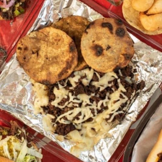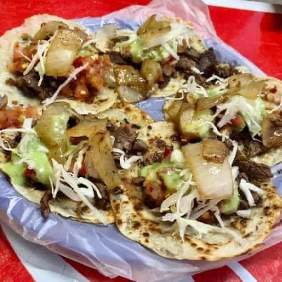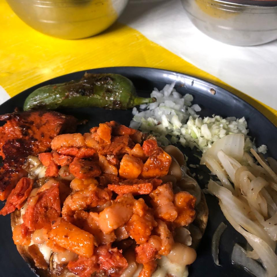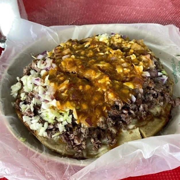 Tortilla dorada, queso Chihuahua, carne adobada, frijoles, cebolla, repollo, salsas y cebolla asada