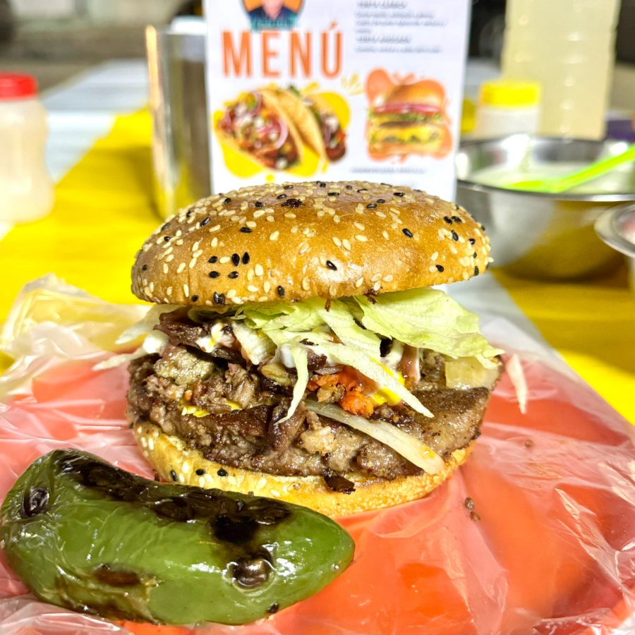 Doble carne casera, queso amarillo, cebolla asada,tomate, lechuga, mayonesa, catsup y mostaza