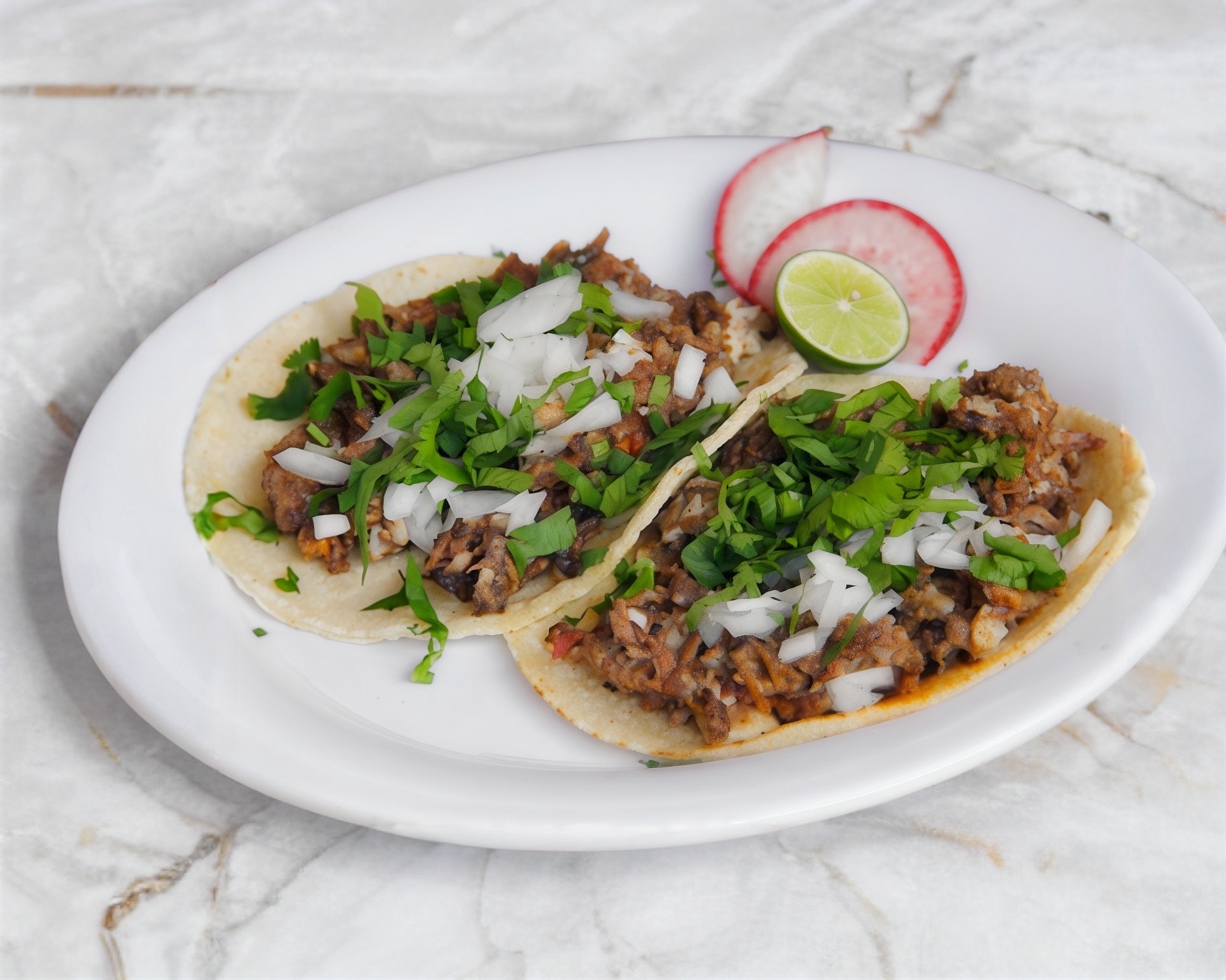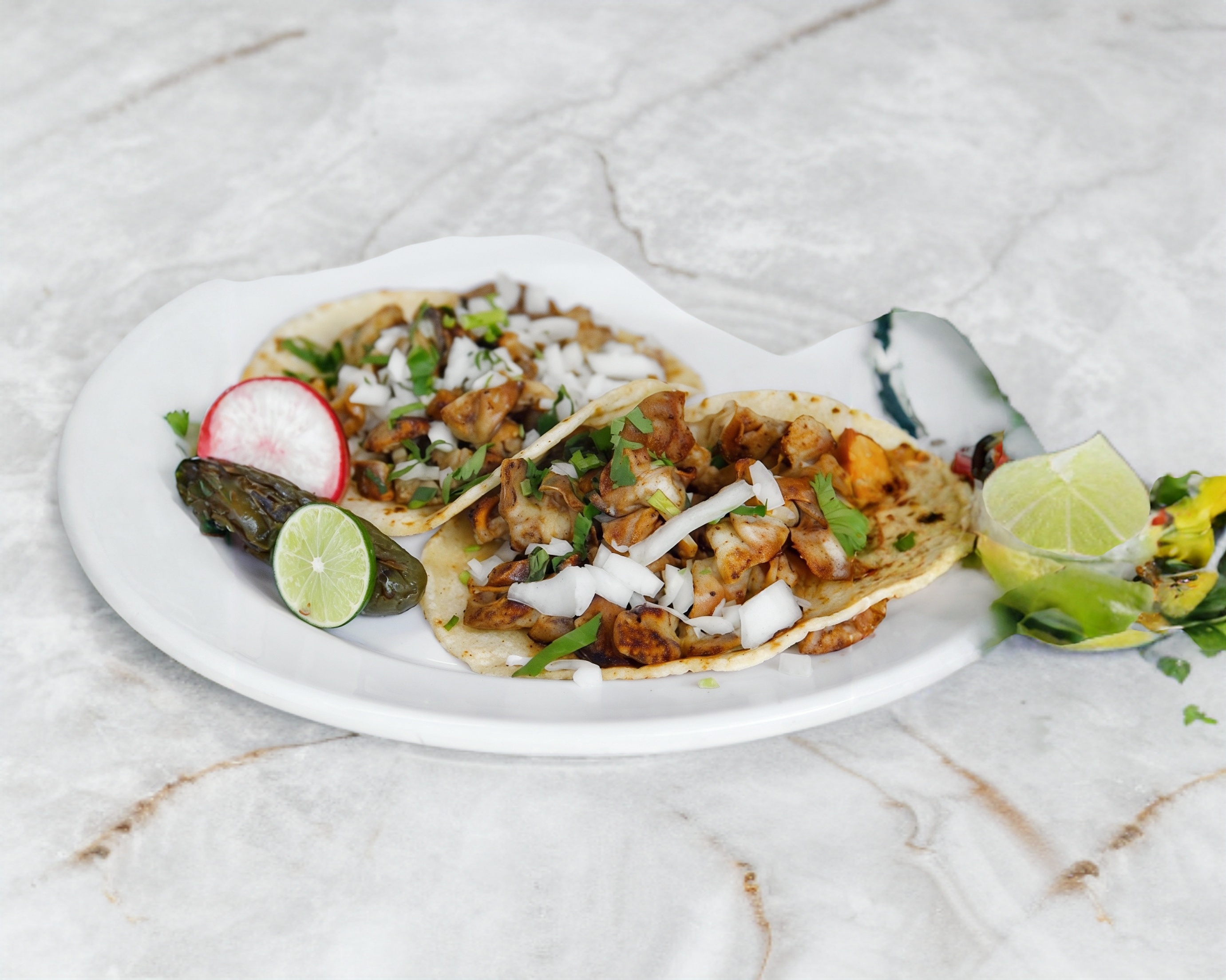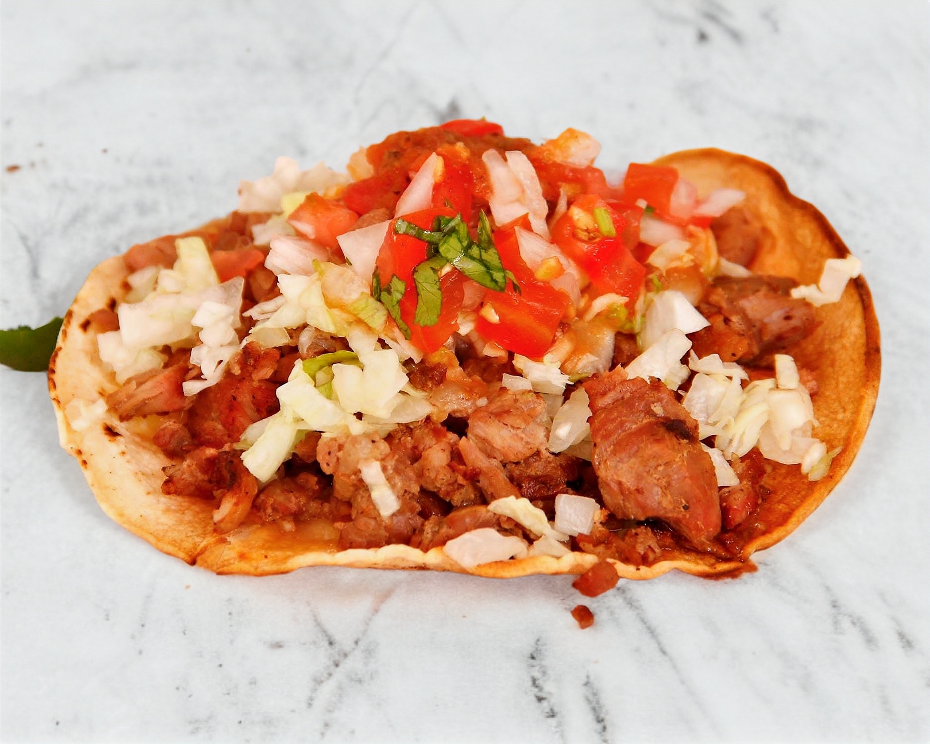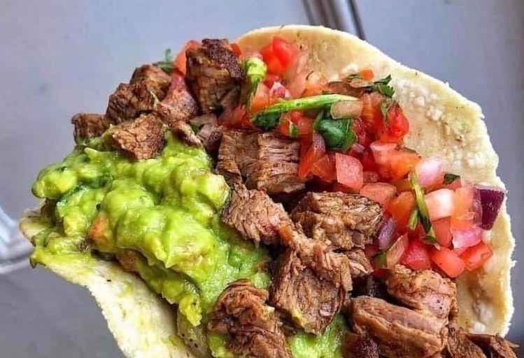 Taco Asada a base de harina de maiz de Sirloin lechuga aguacate cebolla y cilantro , salsas Aparte