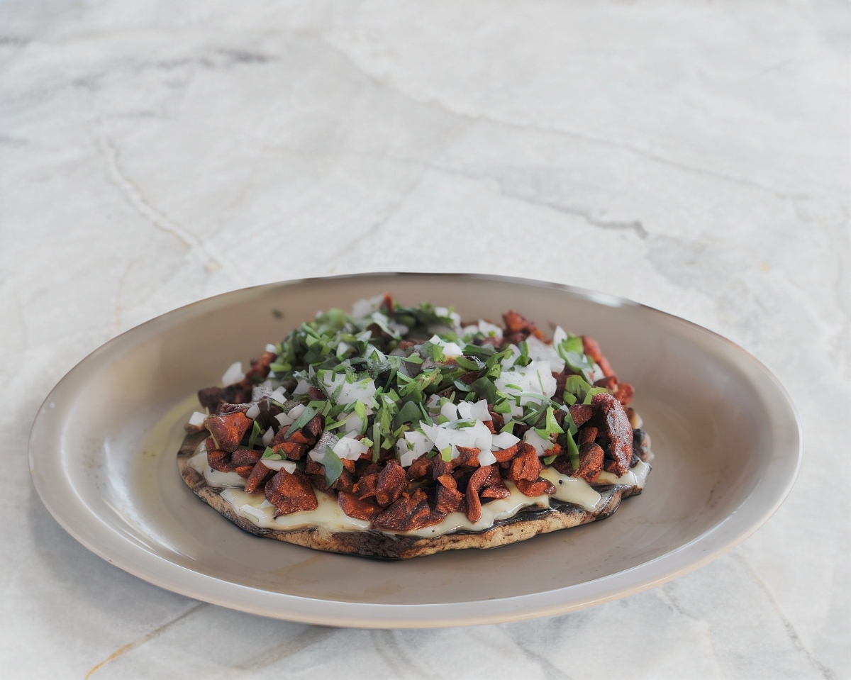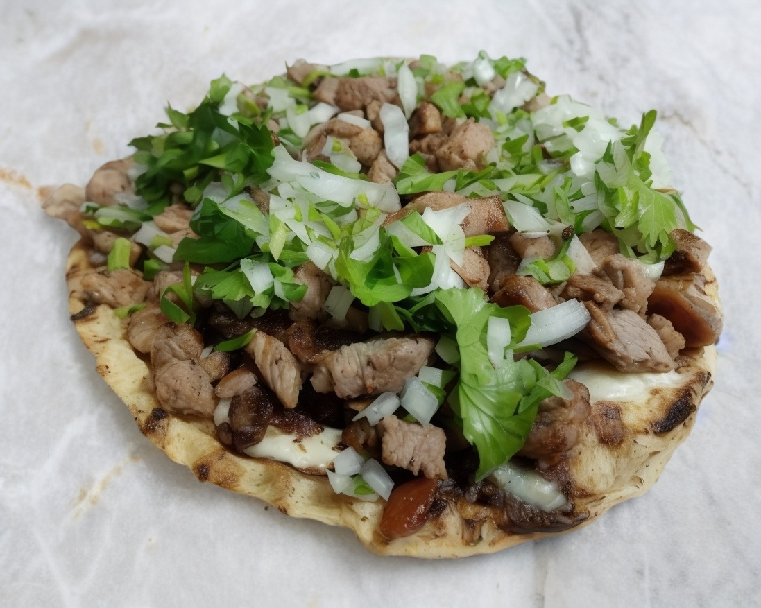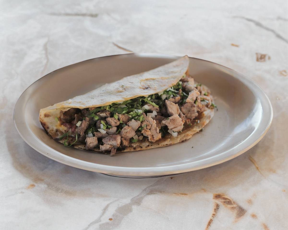 2 Tortillas de harina, sincronizadas con queso derretido en medio, porción de carne pastor, cilantro y cebolla.