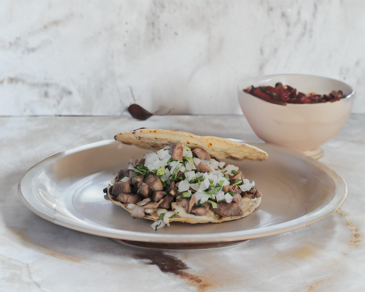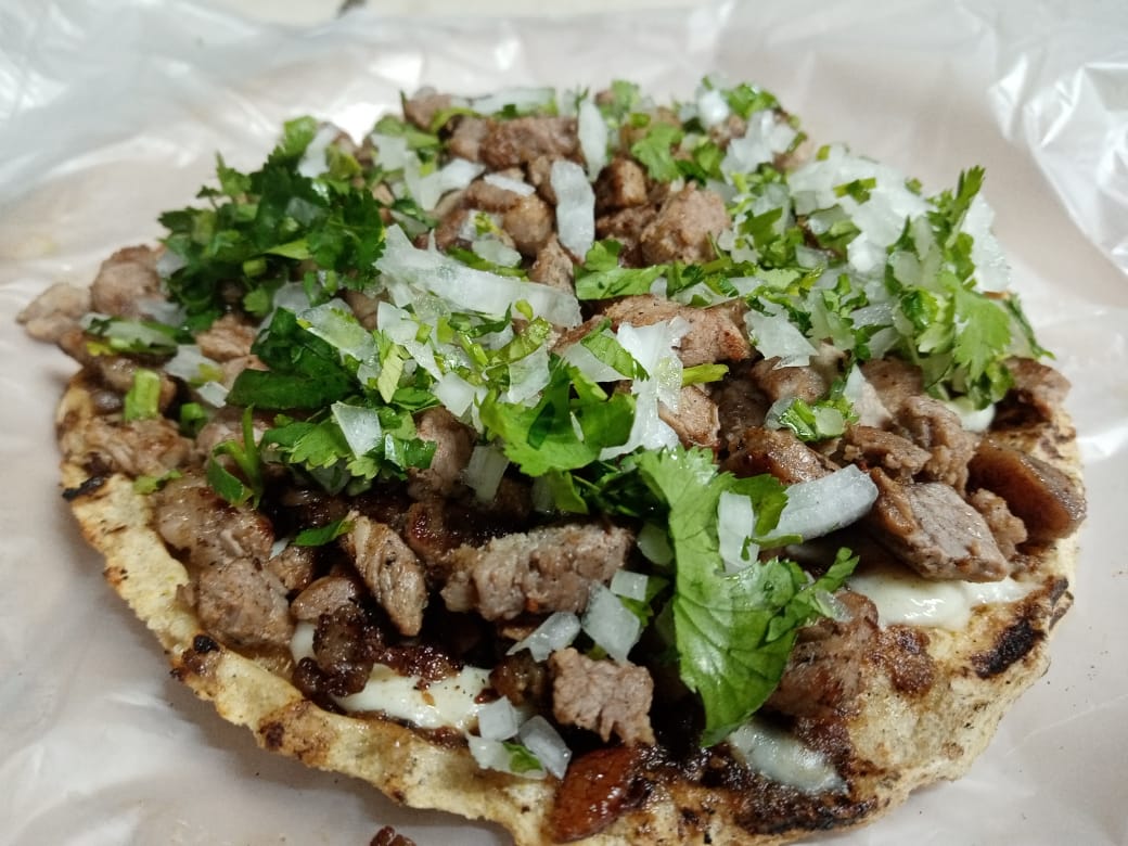 Tortilla de maíz hecha a mano, con asientos de puerco, queso derretido, porción de carne a elegir, cilantro y cebolla.