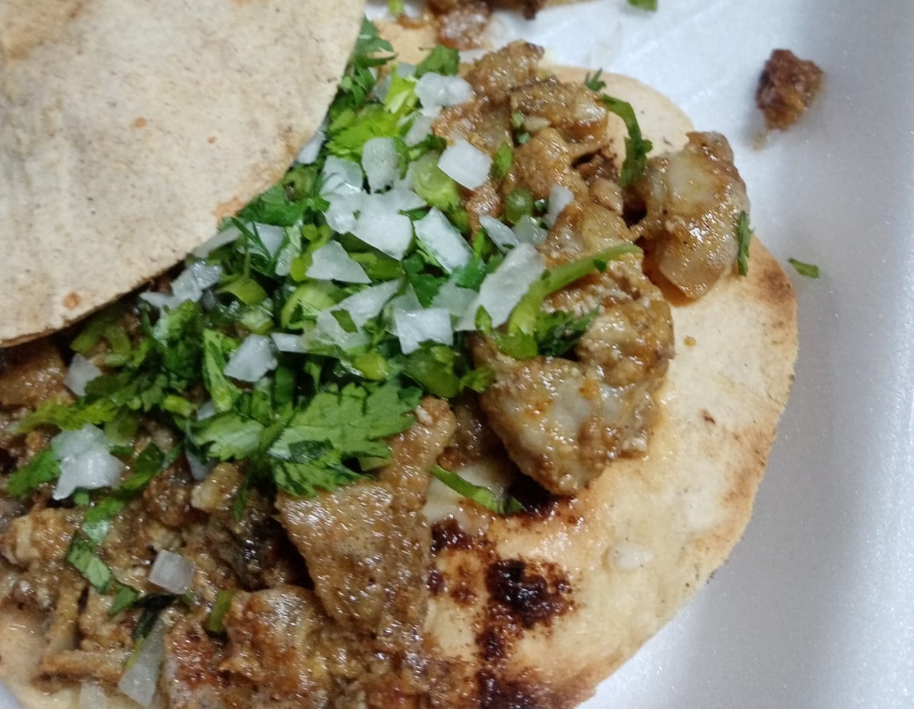 Tortilla de harina, porción de tripa y por encima cilantro y cebolla.