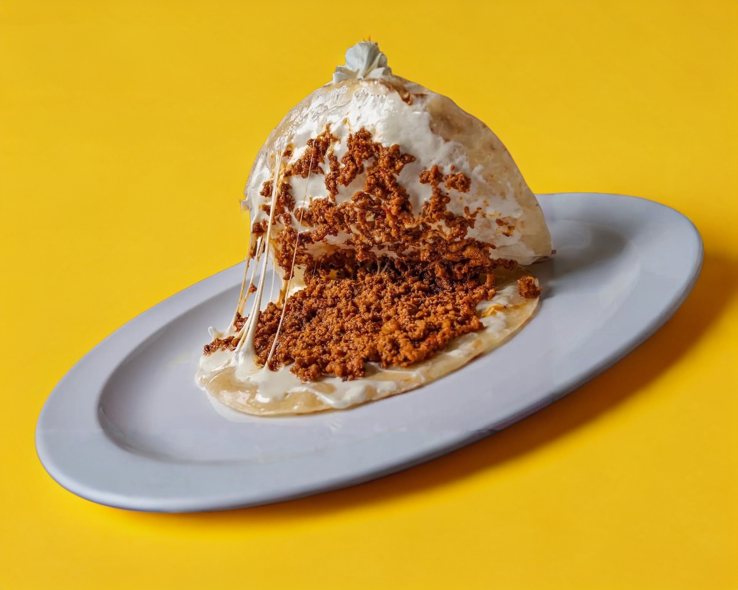 Tortilla de maíz dorada, con queso Oaxaca y una porción de carne al pastor.