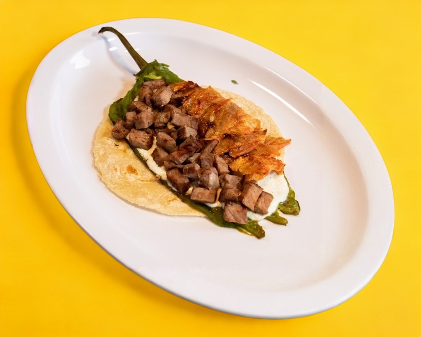 Tortilla de maíz o harina con un chile anaheim asado, porción de queso Oaxaca y una porción de carne top sirloin.