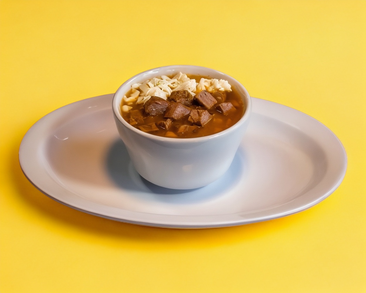 Frijoles charros de la casa con una porción de carne top sirloin y queso Oaxaca..