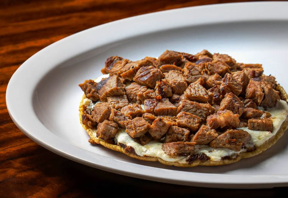 Tortilla de maíz tipo pellizcada con una cama de asientos, queso Oaxaca fundido y carne asada.