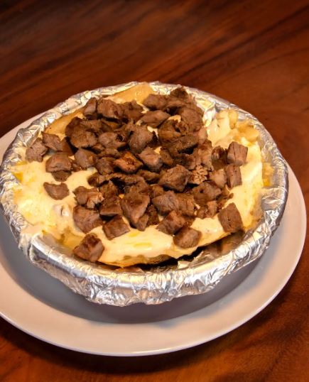Papa al carbón, con mantequilla, queso Oaxaca fundido y una porción de carne asada.