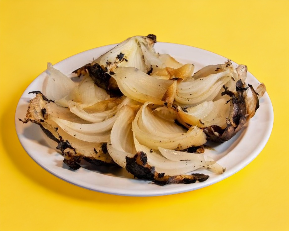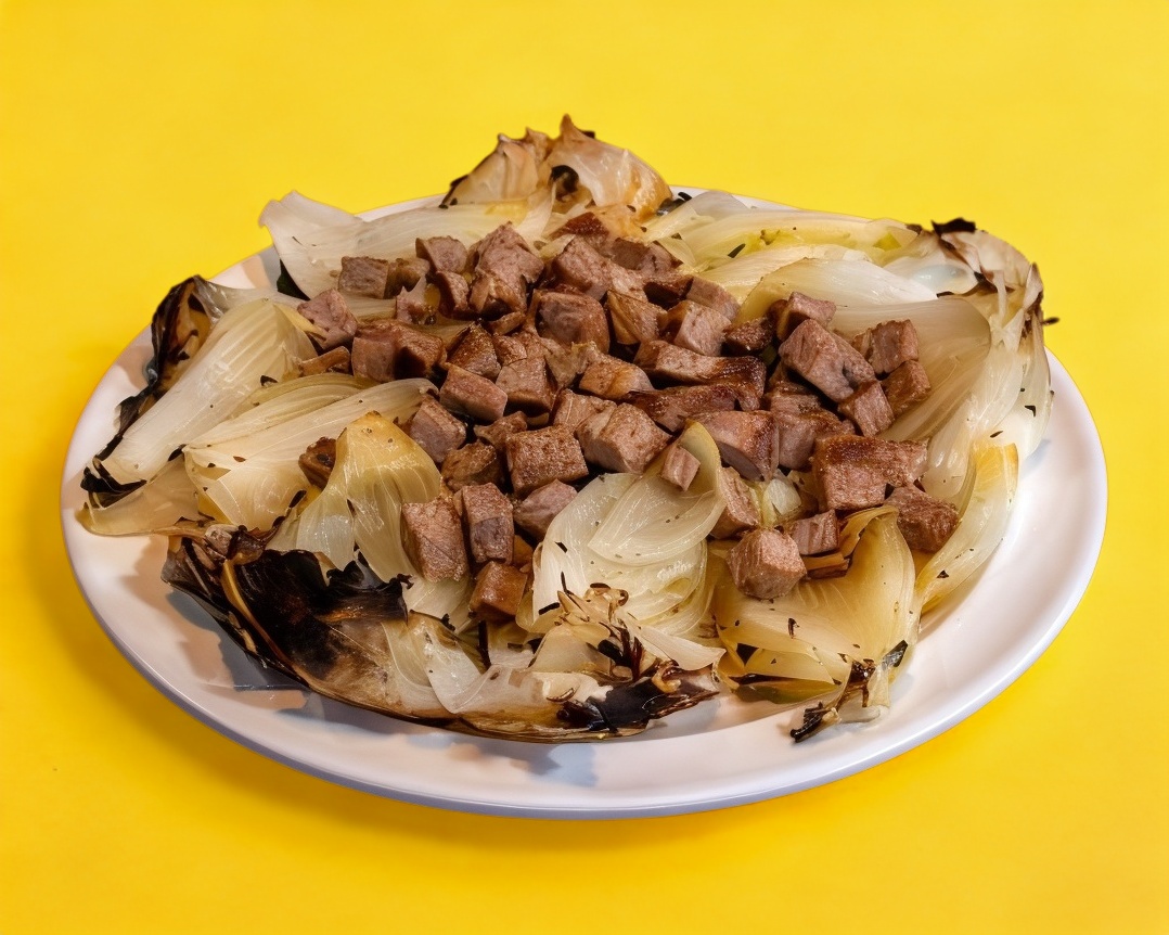 Cebolla asada picada, con un toque de mantequilla y una porción de carne asada top sirloin.