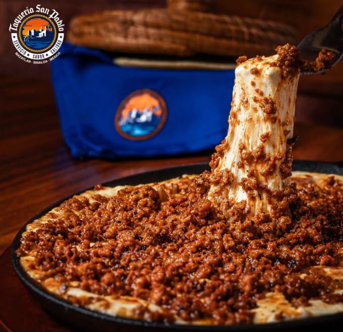 Tortilla de maíz dorada, con queso Oaxaca, una porción de carne asada y al pastor.
