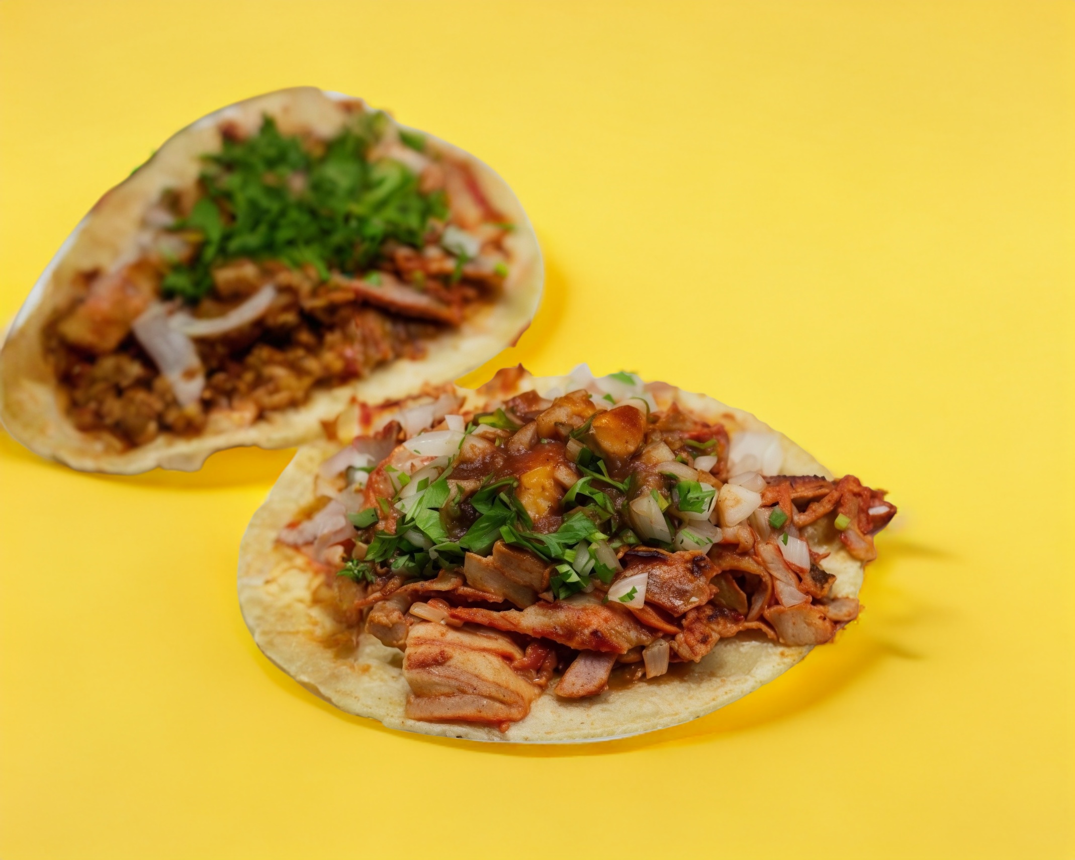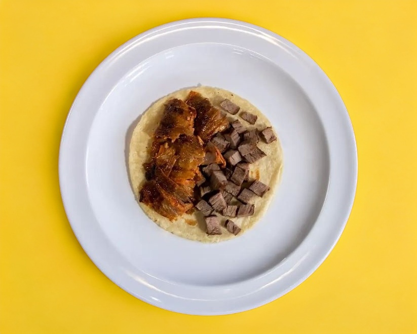 Tortilla de maíz o harina con una porción de carne al pastor y otra de carne asada top sirloin.