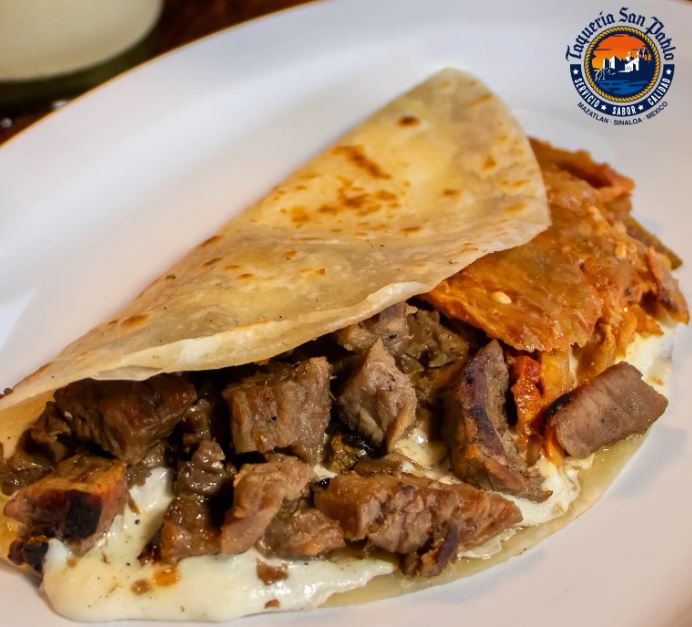 Tortilla de harina con queso Oaxaca, carne asada y carne al pastor.
