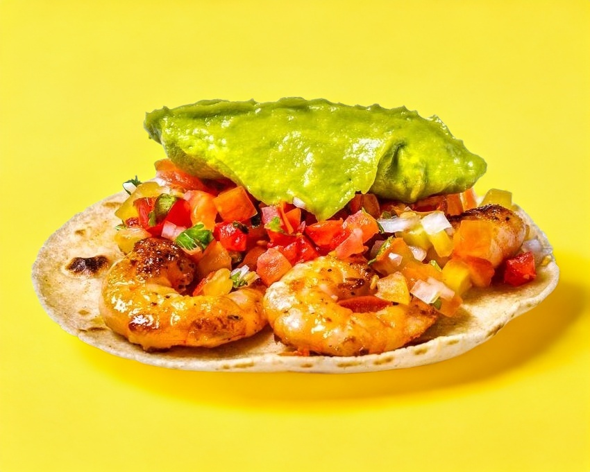 Tortilla de maíz dorada, con queso Oaxaca y una porción de camarones.