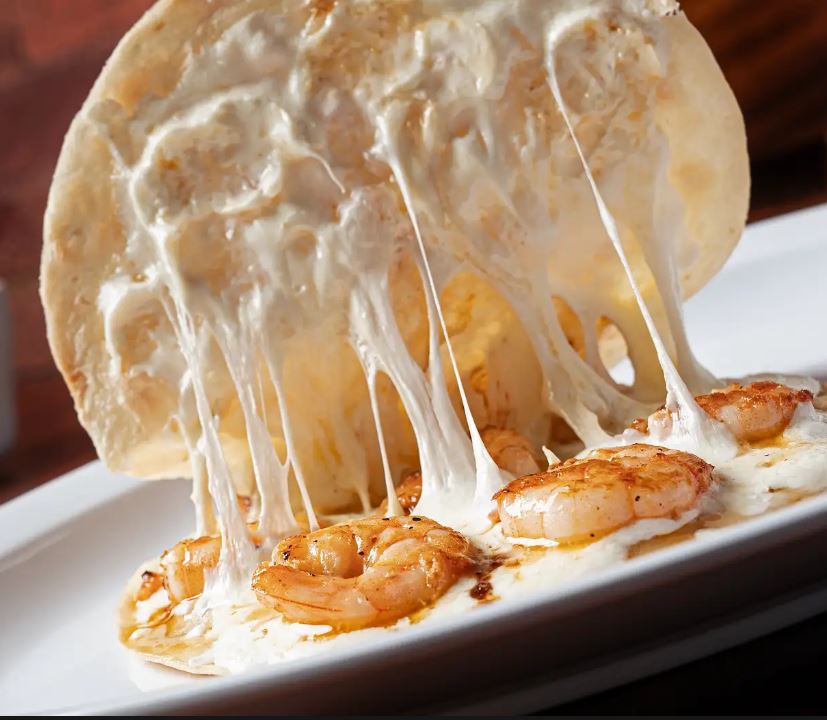 Dos tortillas de harina con queso Oaxaca y una porción de camarones.