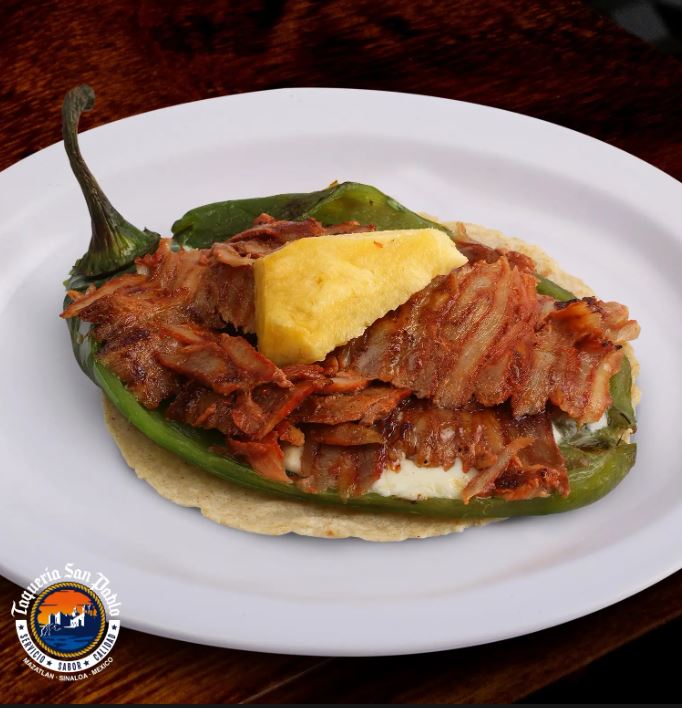 Tortilla de maíz o harina con un chile anaheim asado, porción de queso Oaxaca y una porción de carne al pastor.