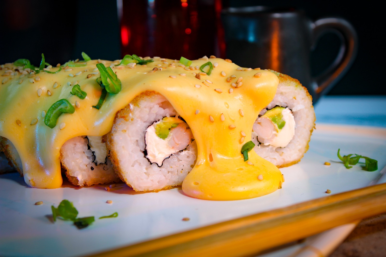 ROLLO EMPANIZADO DE CAMARON, QUESO CREMA, AGUACATE POR DENTRO; BAÑADO EN SALSA DE TRES QUESOS Y CEBOLLIN.