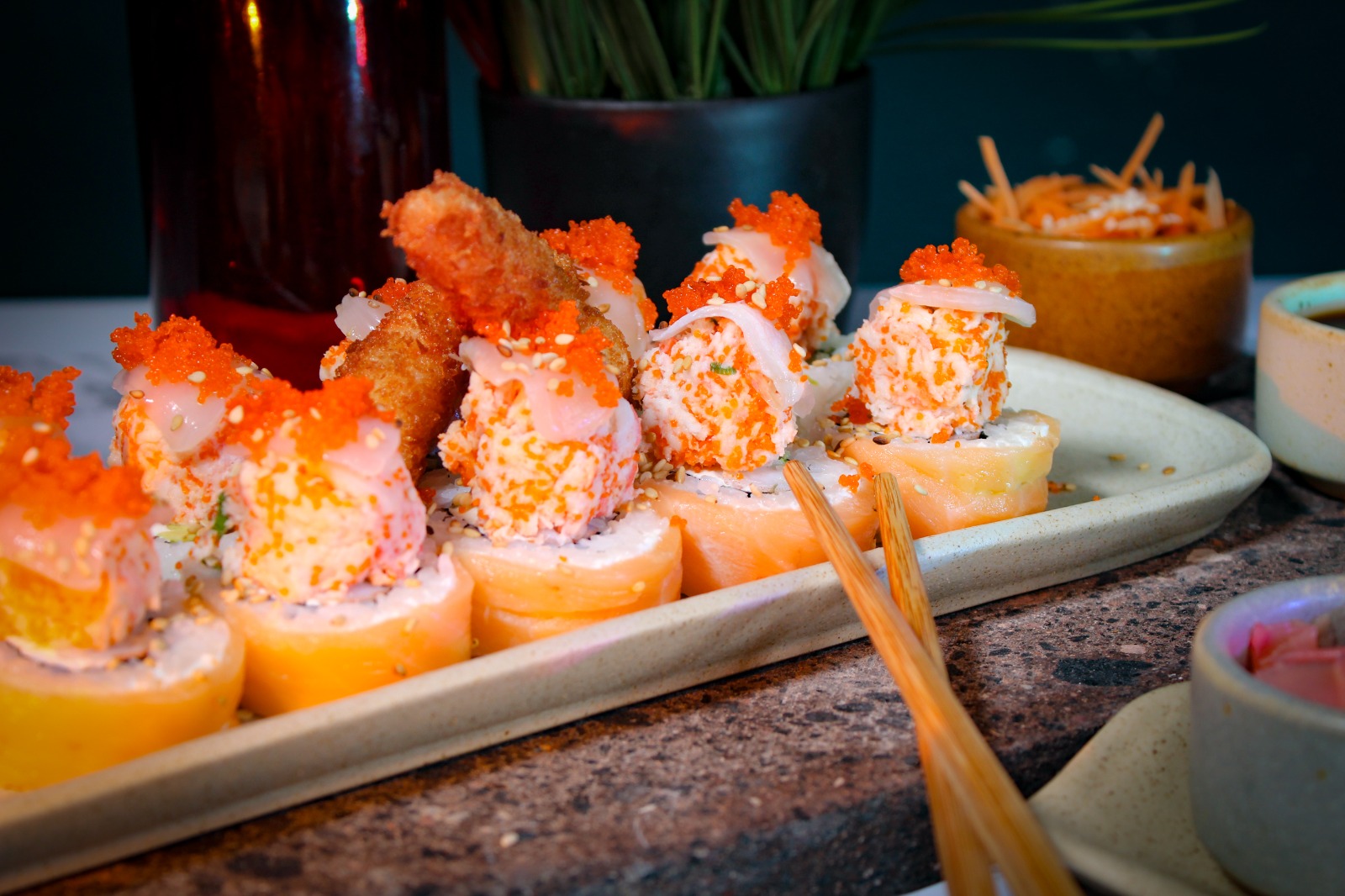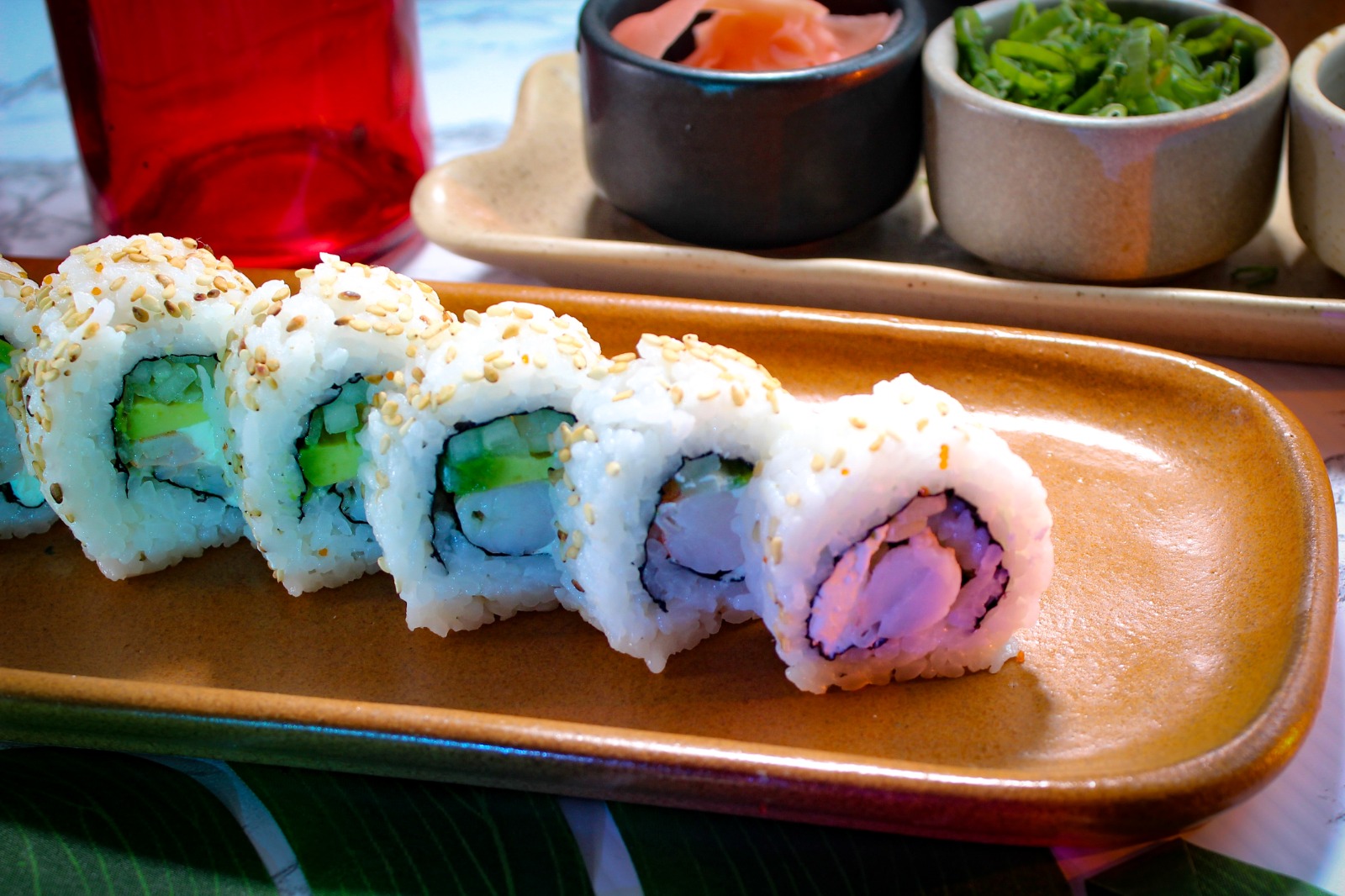 FINO ROLLO DE MASAGO Y AJONJOLÍ POR FUERA; CAMARÓN, PEPINO Y AGUACATE POR DENTRO; TARTAR DE ATÚN CON AGUACATE DE TOPPING.