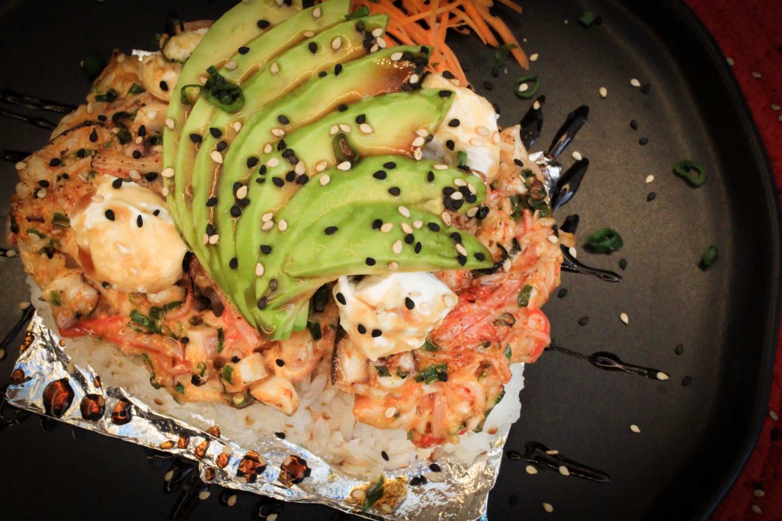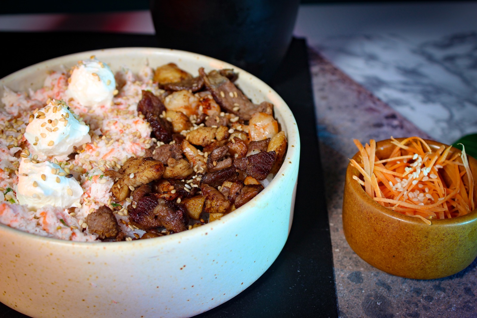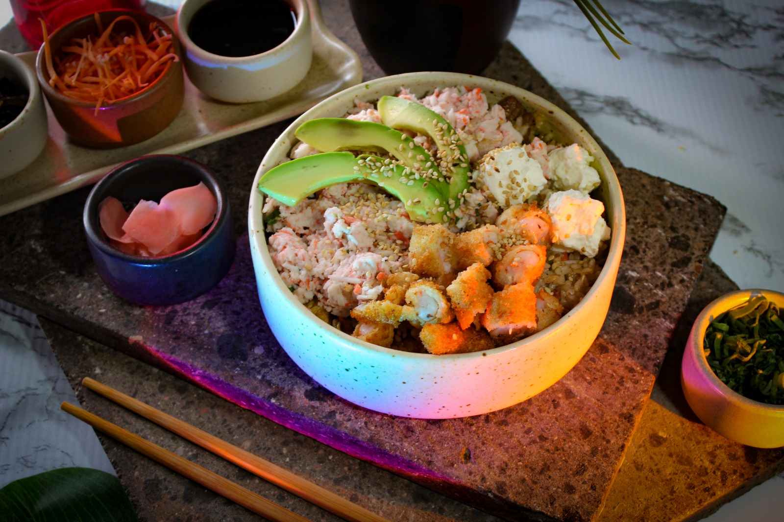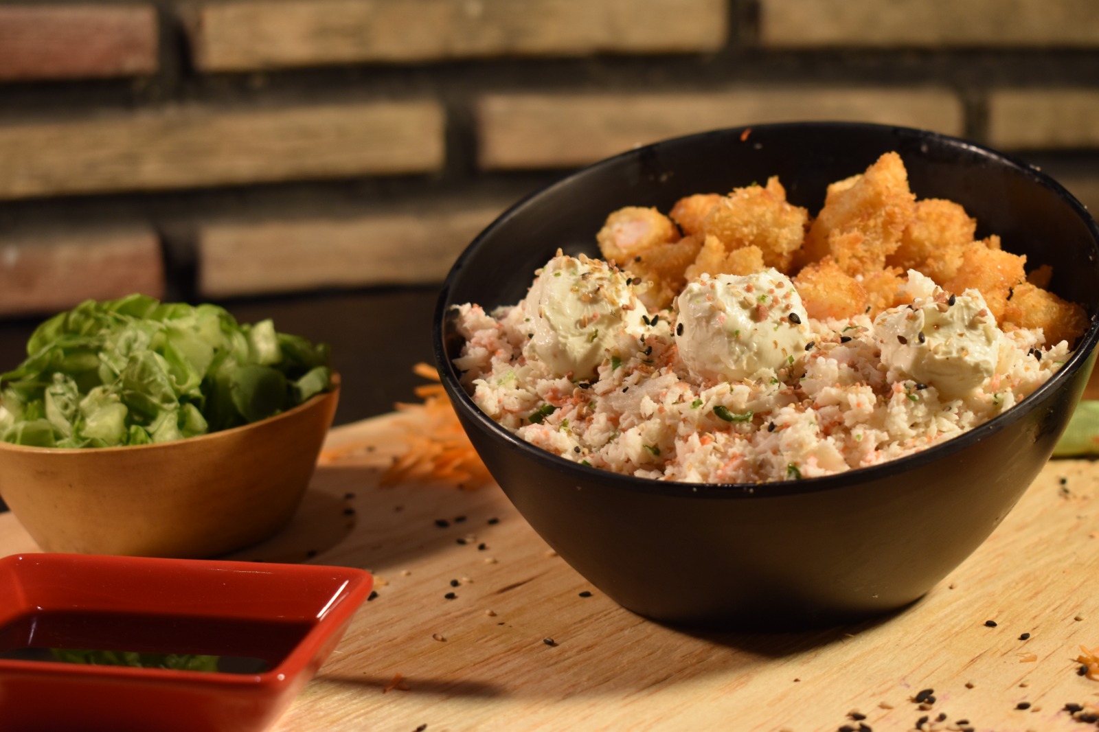YAKIMESHI DE RES, POLLO Y CAMARÓN EMPANIZADO, ACOMPAÑADO DE TOPPING DE AGUACATE, QUESO CREMA Y TAMPICO.