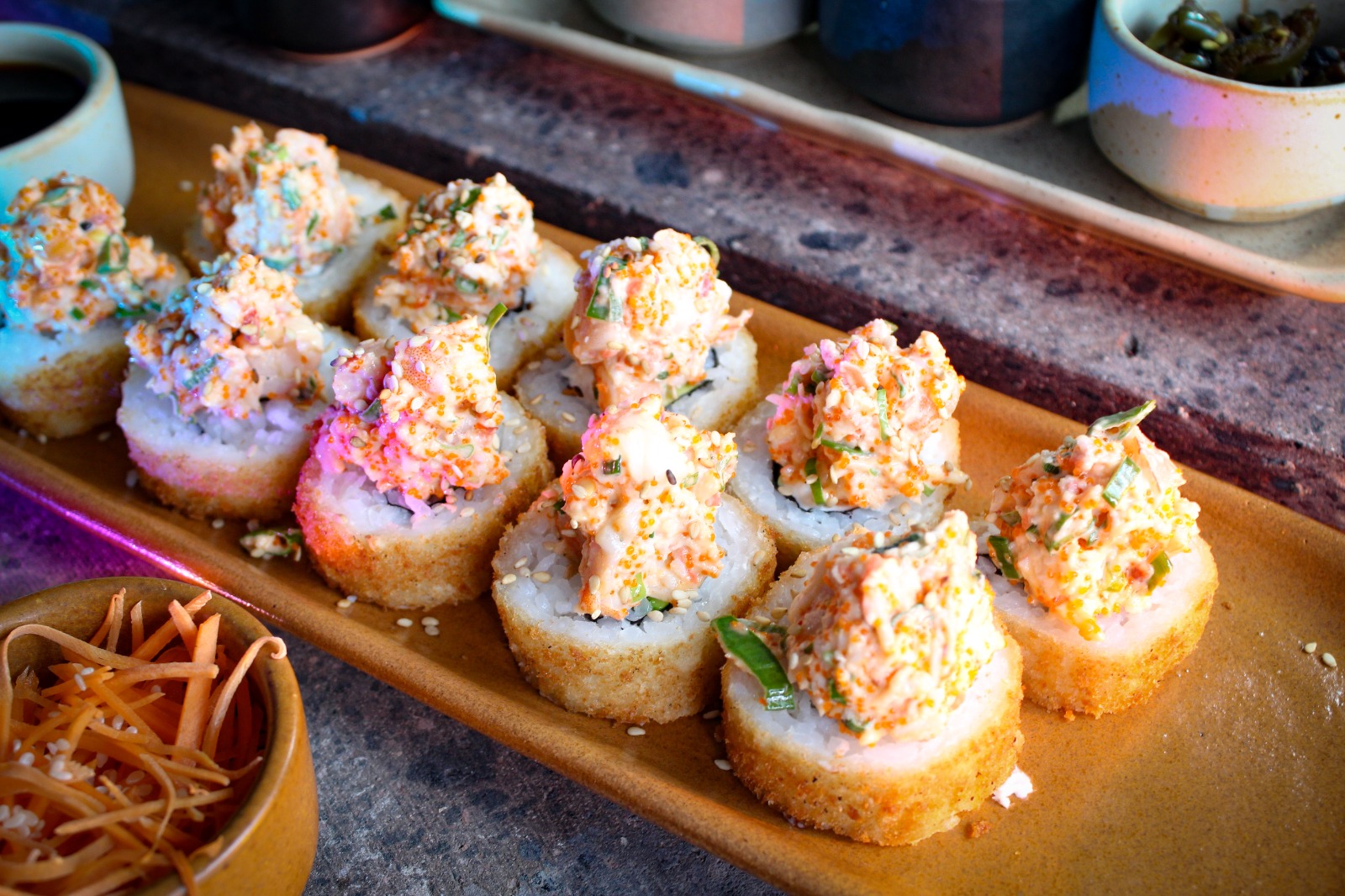 ROLLO ENVUELTO EN ALGA TEMPURA; CAMARÓN, PEPINO, AGUACATE, QUESO CREMA, MASAGO Y TAMPICO POR DENTRO; CORONADO CON SPICY KANI-CALLO.