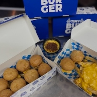 10 mini burgers + Papas + 3 aderezos (2 cheddar y otro a elegir)