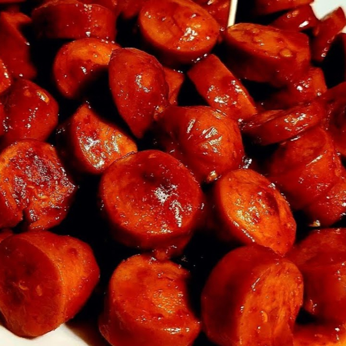Salchichas Rojas Asadas en Trocitos con Salsa y Limon.