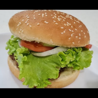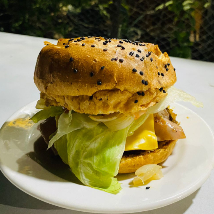 Pan horneado con ajonjoli, Carne, Queso americano, Tomate, Cebolla, Lechuga, Cebollita asada, BBQ, Mayonesa, Crema, Captsu, Mostaza.