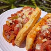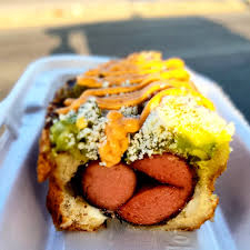 Salchicha en Trocitos con Tocino, Cebolla asada, Guacamole,Tomate, Cebolla, Mayonesa, Crema.
