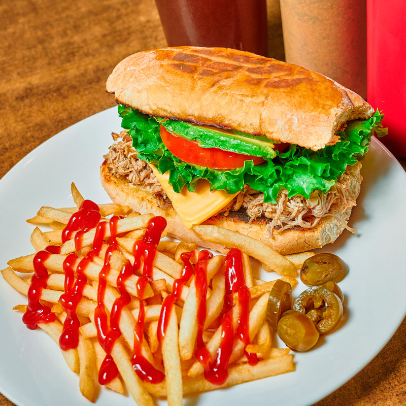 Pan Horneado, Carne de Pierna, Tomate, Cebolla, Lechuga, Aguacate, Mayoneza, Crema, Mostaza y Chile toreado.