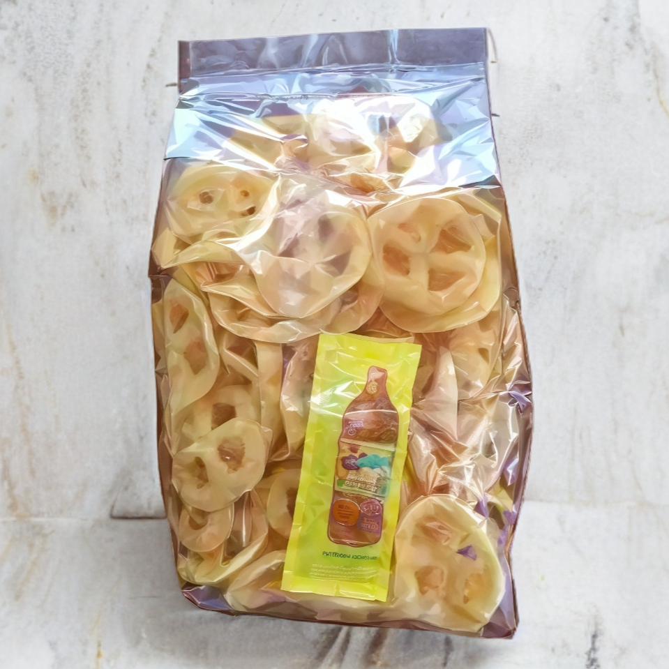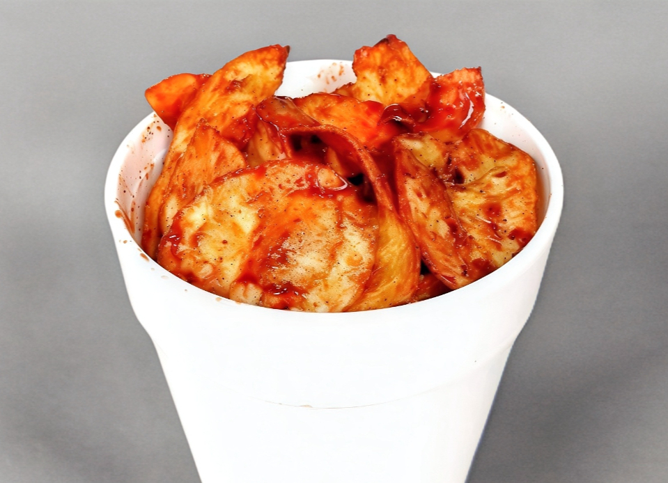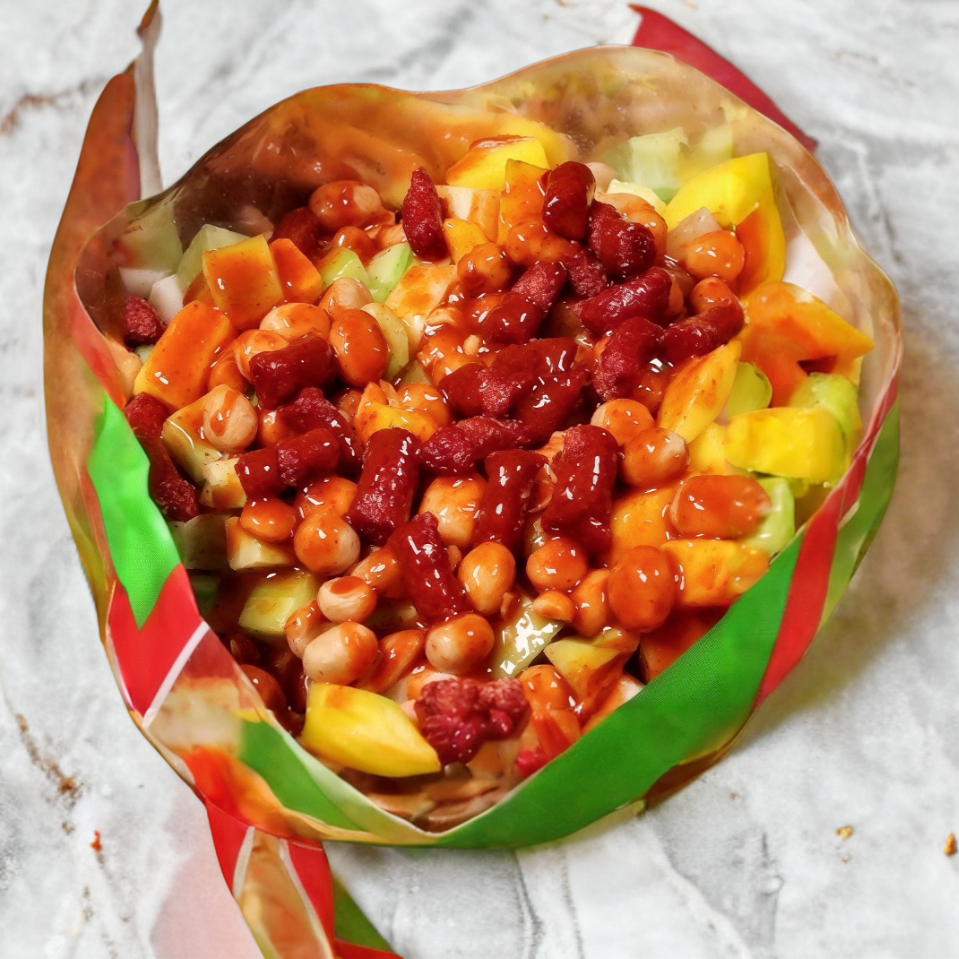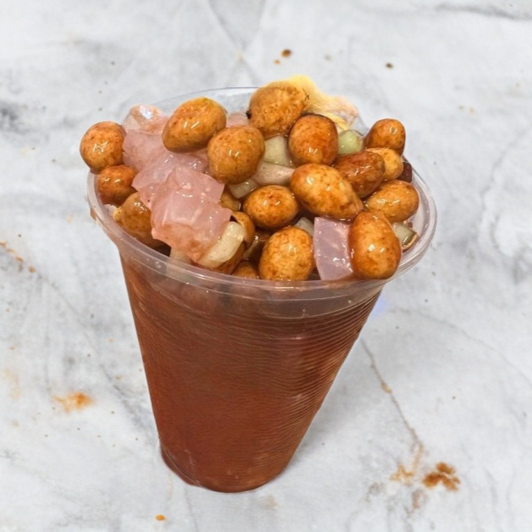 Papas caseras, churro de maíz, cacahuate, cuerito, pepino, rielito y clamato.