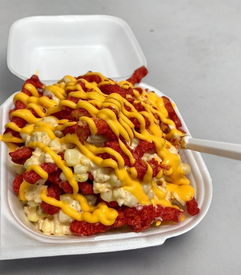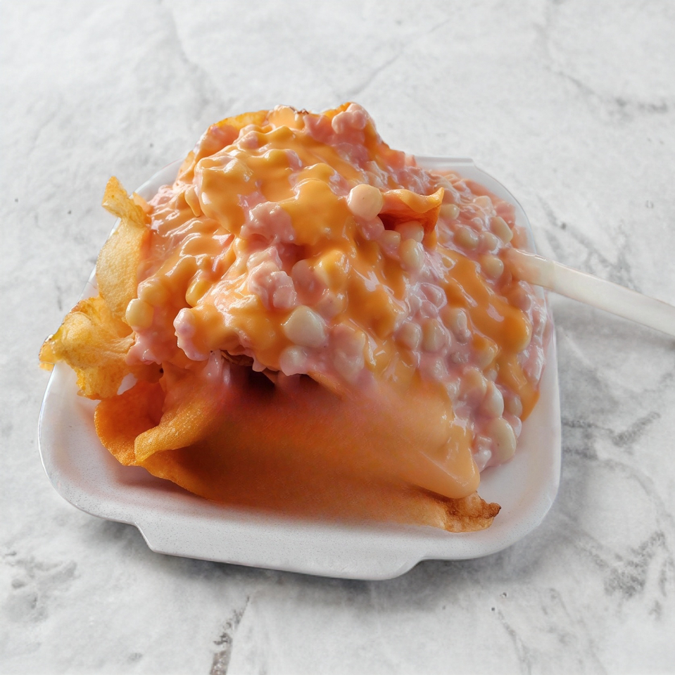 (Personal) Sabritas a elegir, elote desgranado con crema, queso cotija, mayonesa y queso amarillo.