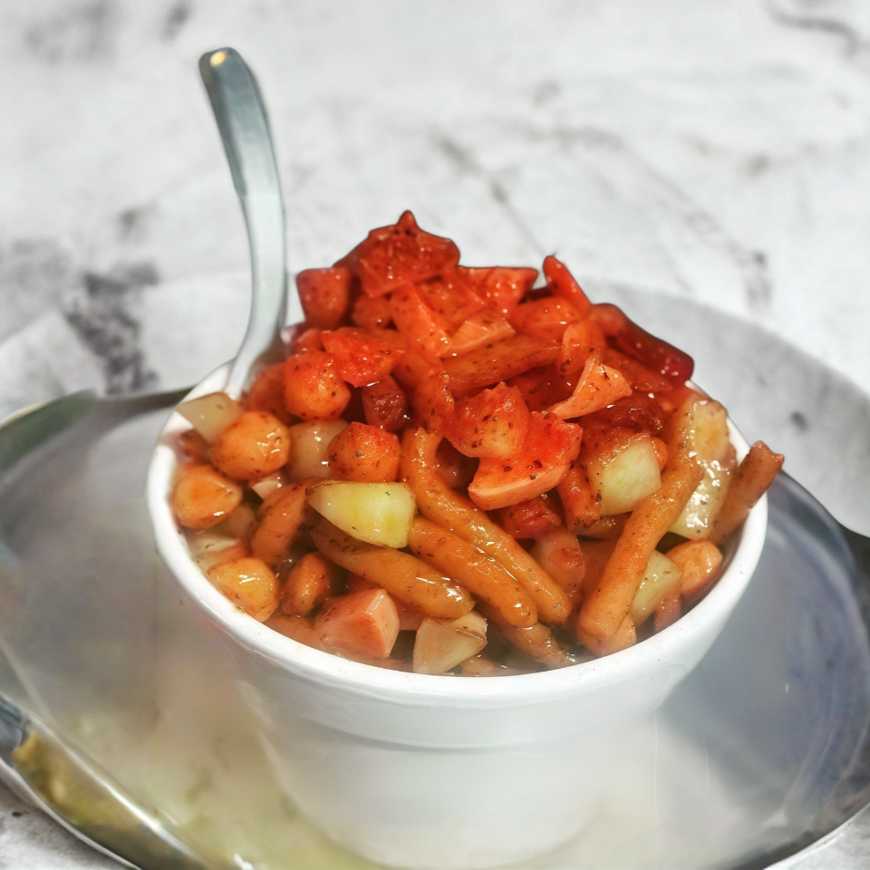 Cueritos, pepino, cebolla morada, tomate, limon, sal y pimienta.
