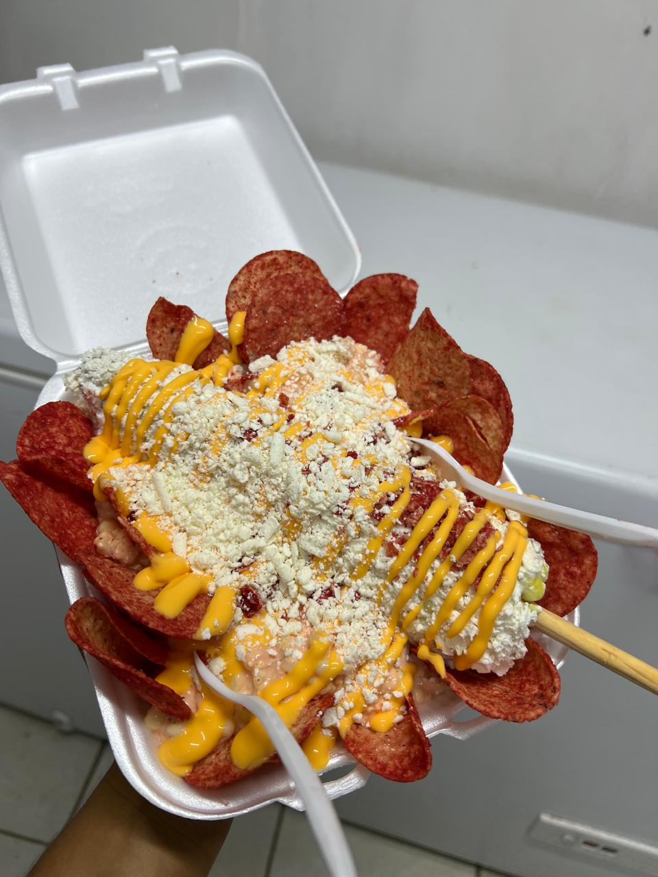 Sabrita a elegir, ceviche sierra, cuerito, pepino, cacahuate, rielito y clamato.