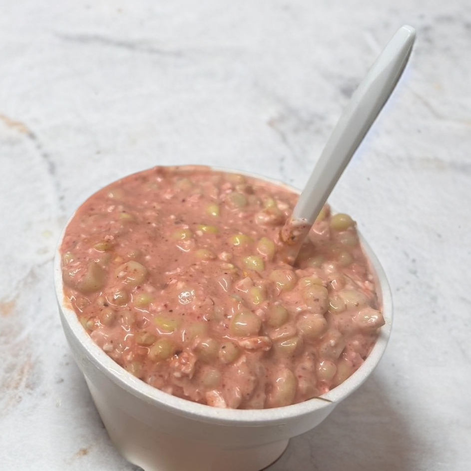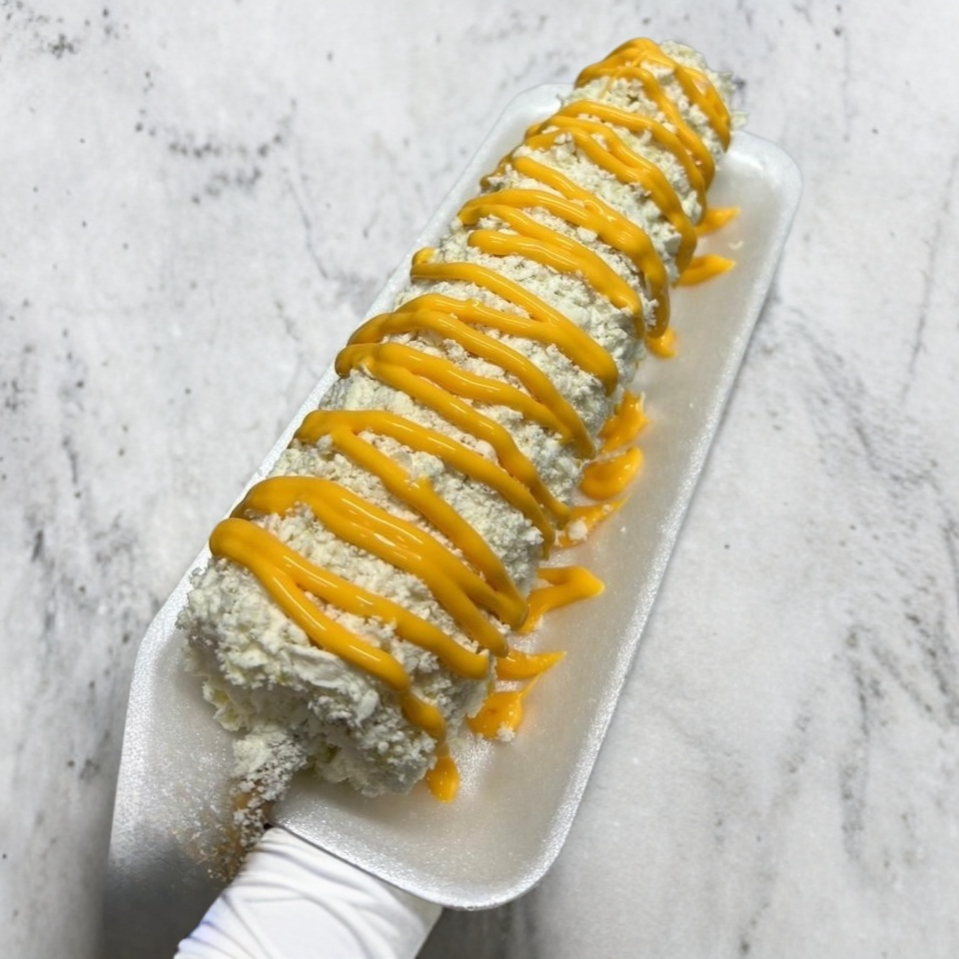 Elote desgranado en vaso con crema, queso cotija, mayonesa y queso amarillo.