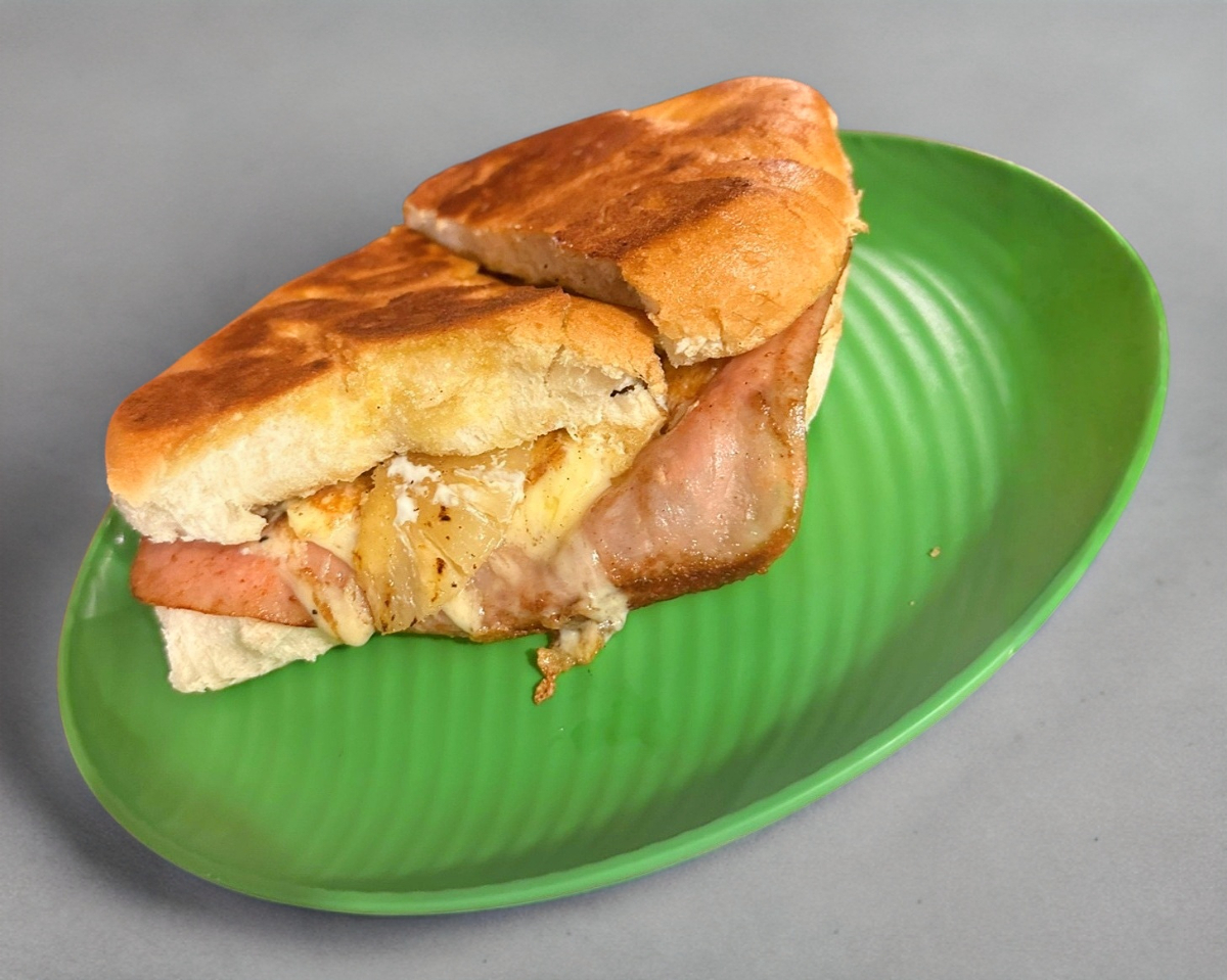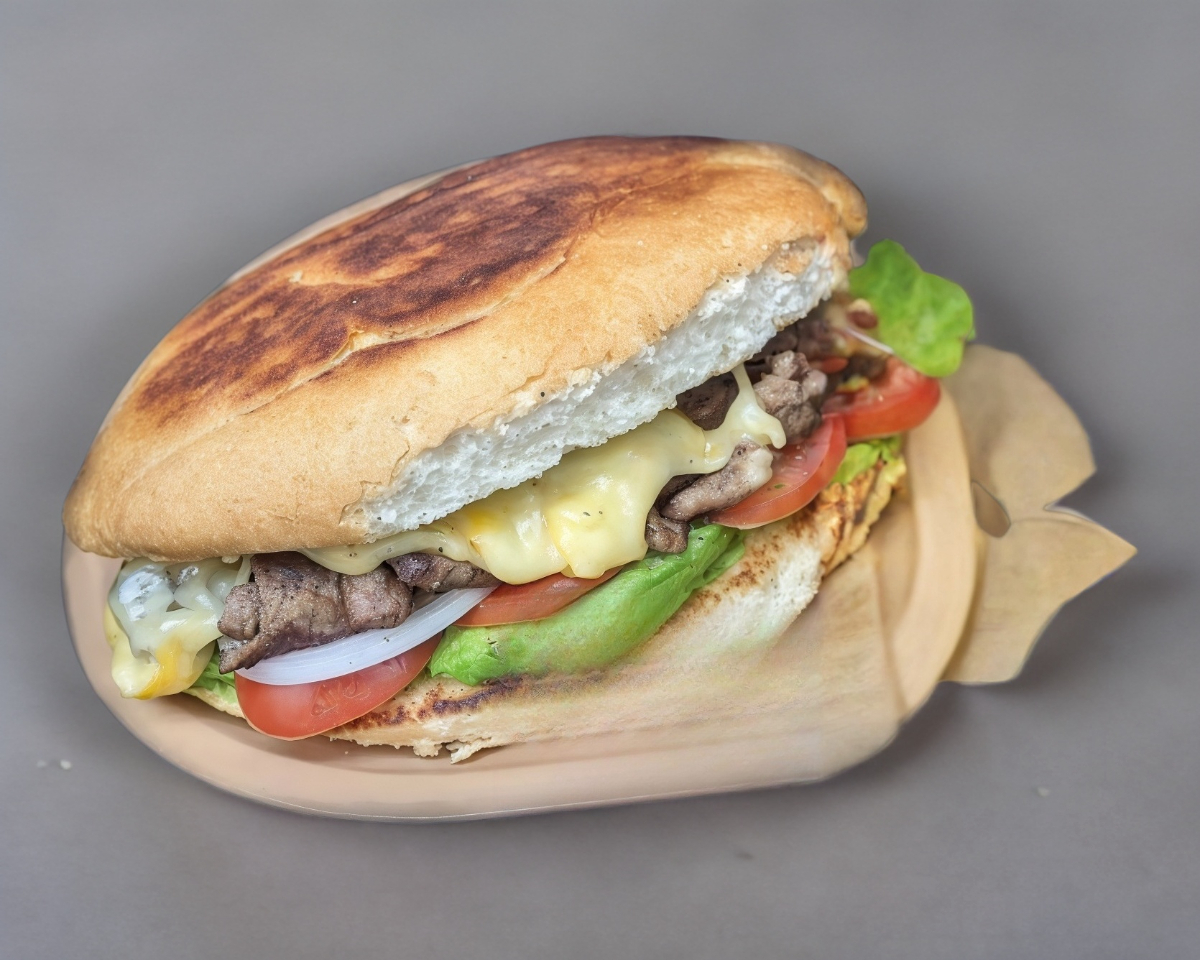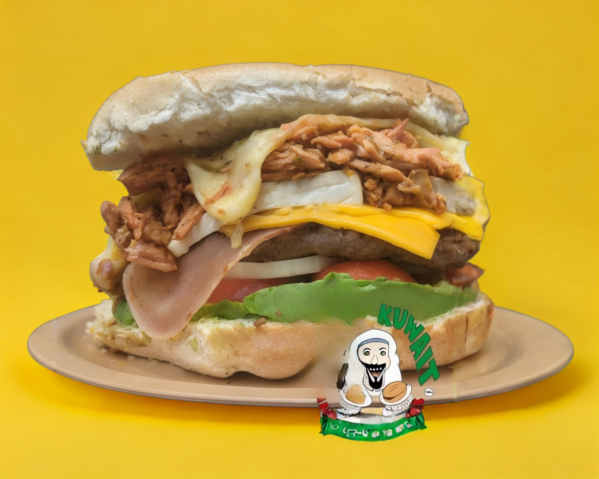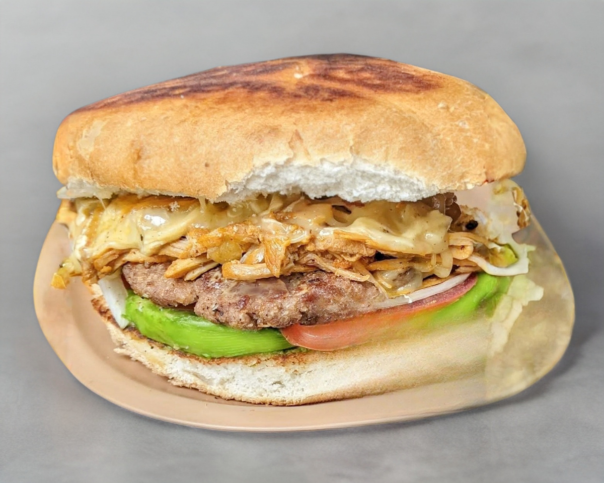 hamburguesa con jamón, queso panela, queso amarillo y queso fundido