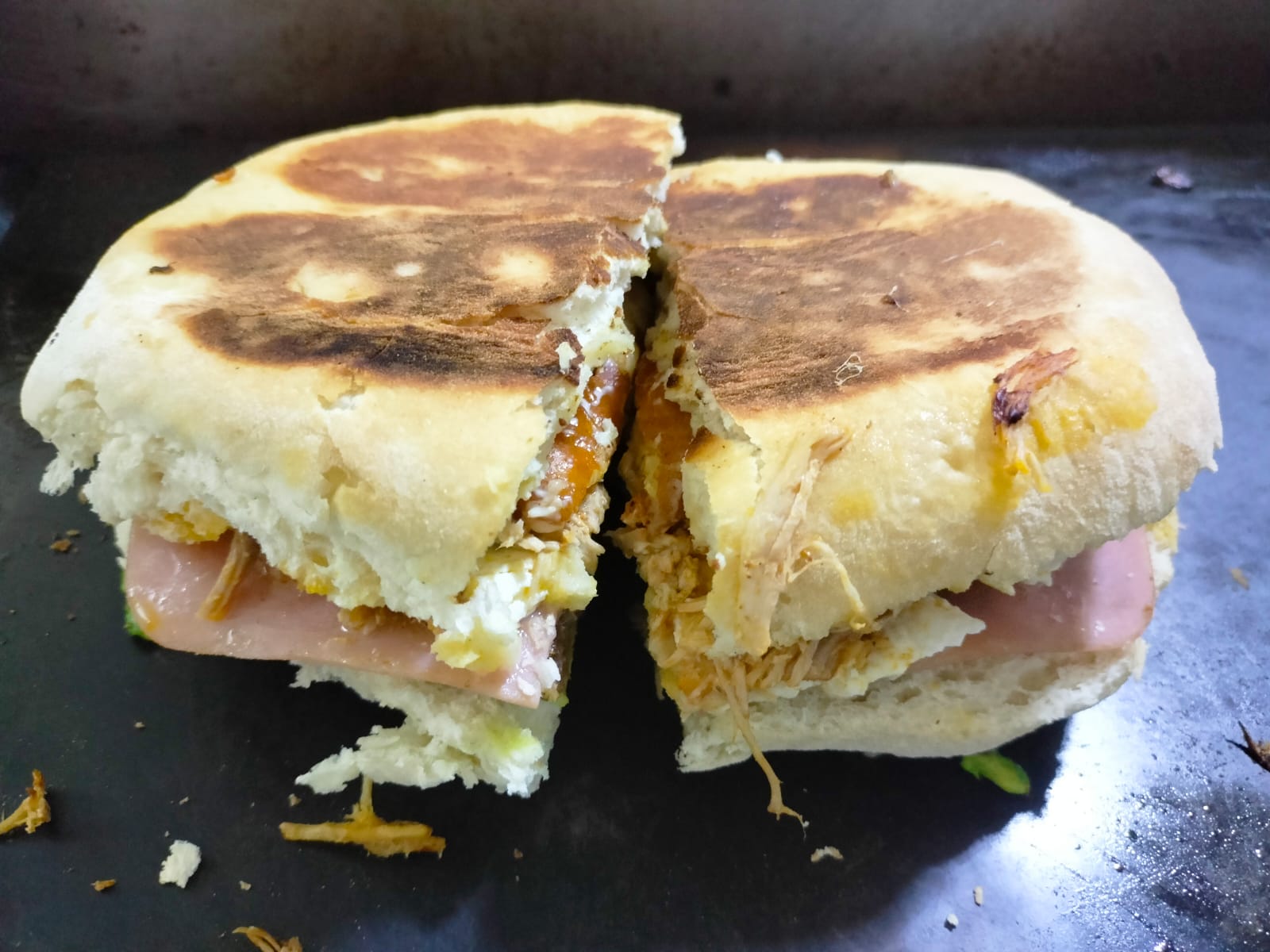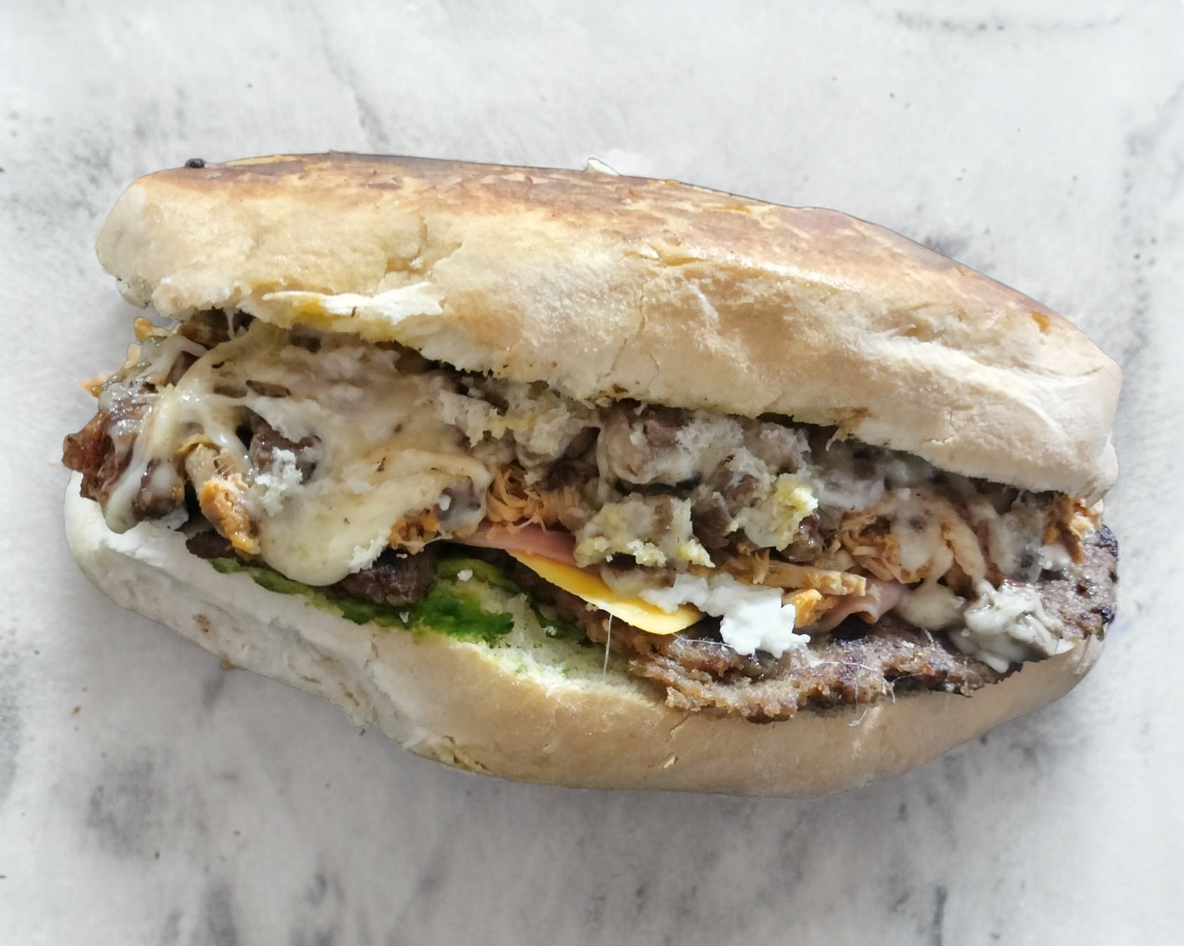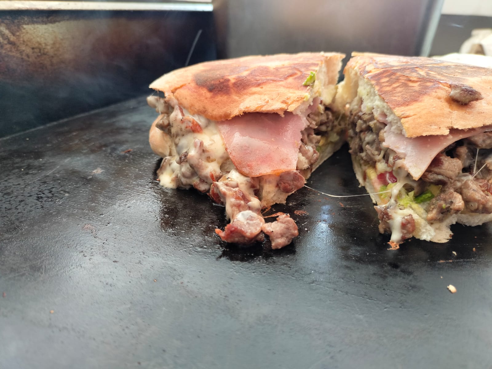 Carne asada, queso fundido y jamón. (pan artesanal que puede variar el tamaño pero es el mismo contenido por dentro)