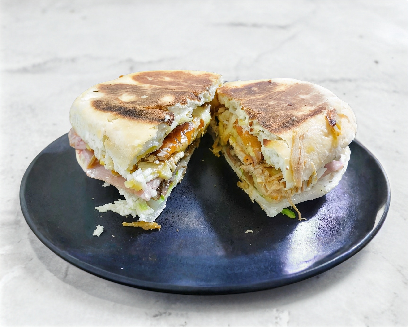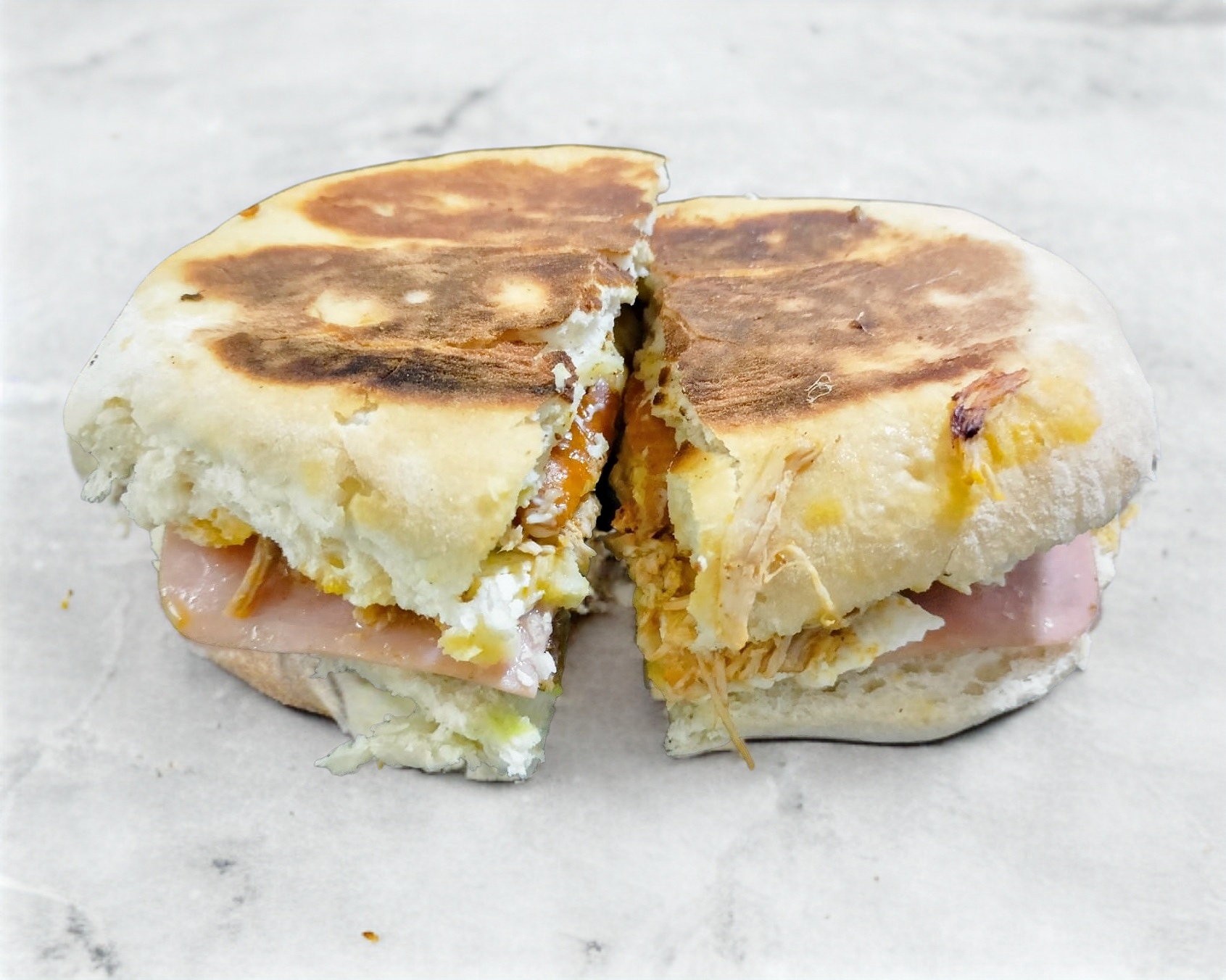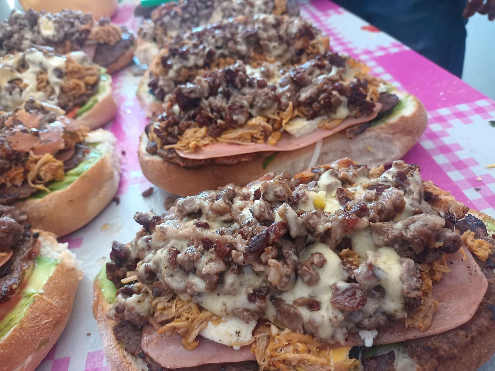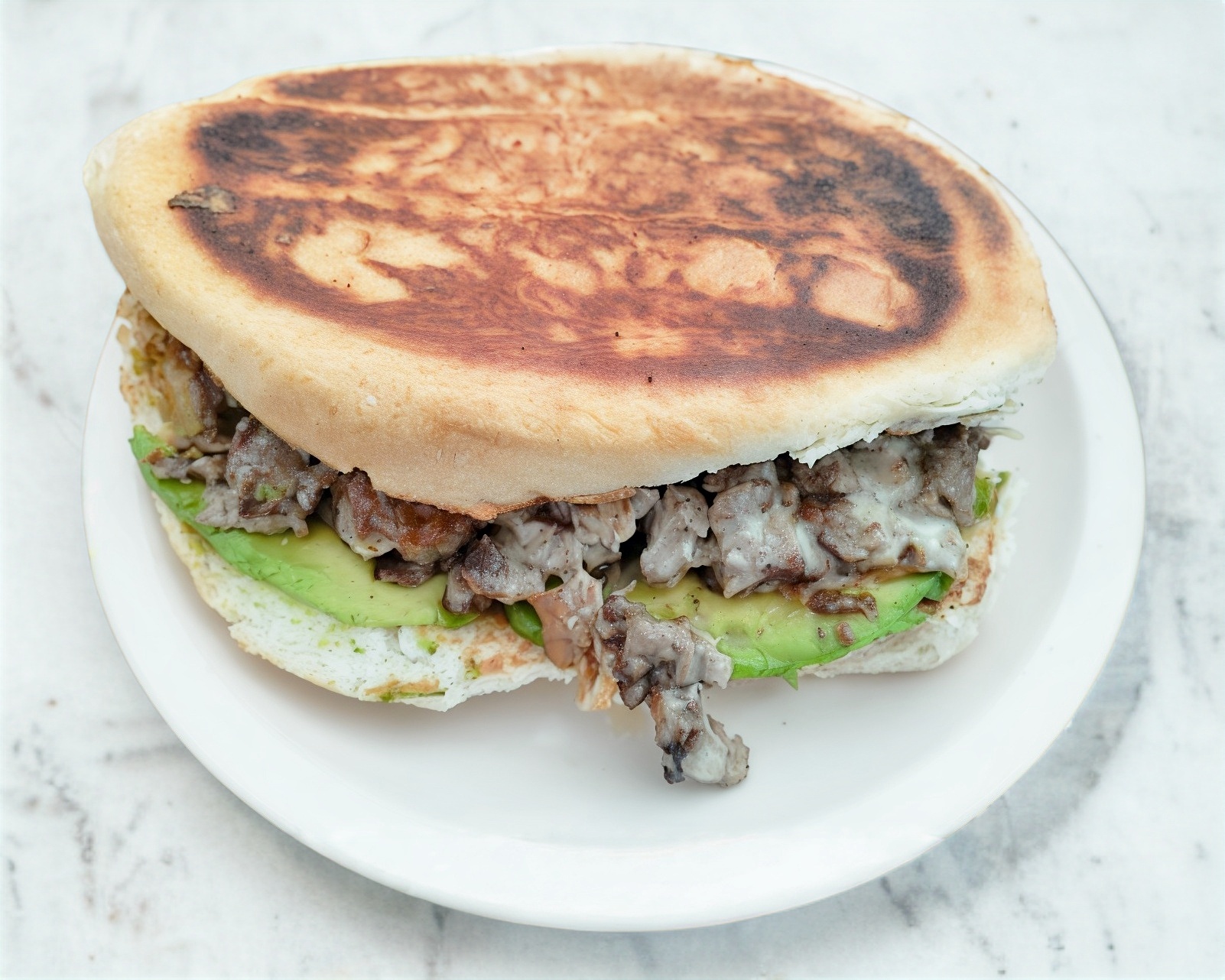 Carne asada, queso fundido y jamón. (pan artesanal que puede variar el tamaño pero es el mismo contenido por dentro)