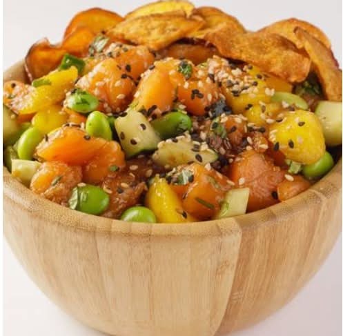 Base de arroz integral, salmón en salsa house agridulce, cilantro, edamames, mango, pepino. Acompañado con chips de camote.
