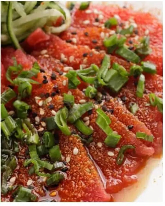 Frescas laminas de atún montadas sobre pepino espiralizado, con topping de Cebollin, Togarashi, Shoyu, y nuestra salsa House Agridulce.