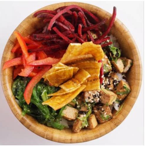 Base arroz integral y quinoa, tofu en salsa sweet ajonjoli , cilantro, betabel, pimiento, alga wakame, con topping de plátano chips.
