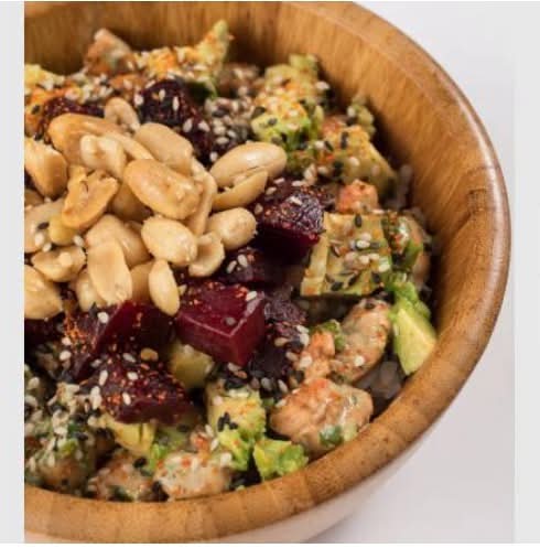 Arroz integral-pepino noodles, salmón a la parrilla, acompañado de aguacate y betabel con salsa cilantro, coronado con cacahuate tostado y togarashi.