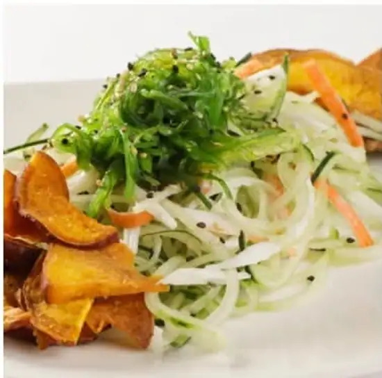 Ensalada de noodles de pepino y surimi aderezado con una vinagreta agridulce, topping de alga wakame y side de chips de camote.