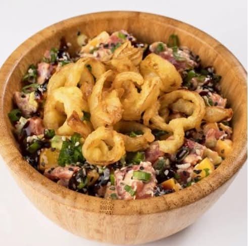 Base de arroz blanco con atún en salsa spicy, aguacate, mango, cilantro y cebollín. Con topping de cebolla tempura crujiente y salsa de anguila.