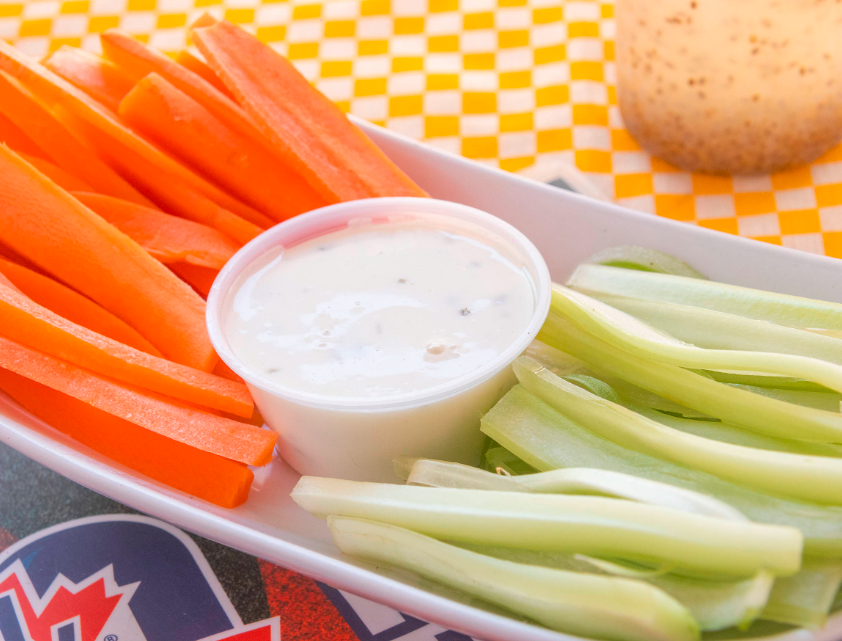 Bastones de zanahoria 85 g, y apio 100 g, acompañados de aderezo ranch 59 ml.