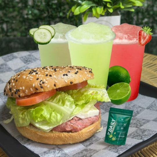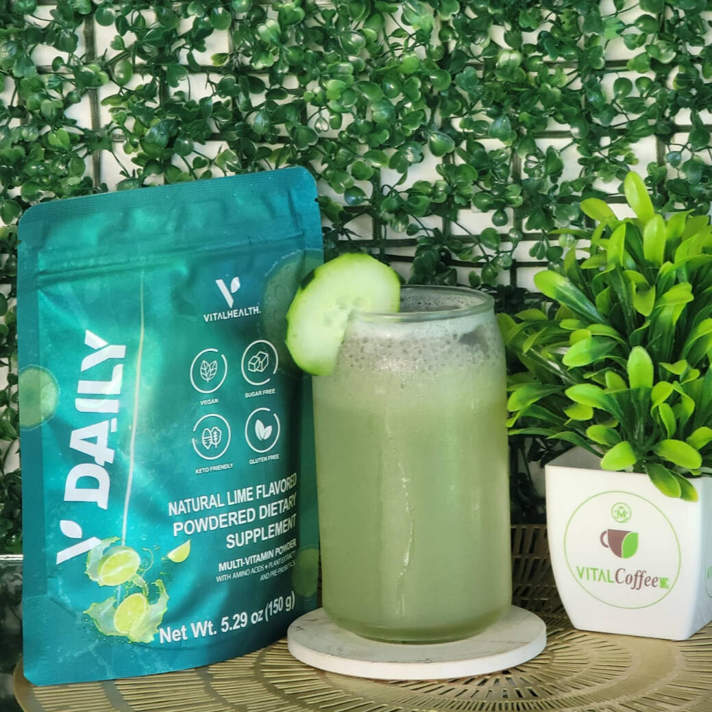 Limonada de Pepino con CUP de 🥤 V-DAILY Una bebida multivitamínica que impulsa tu energía y refuerza tu sistema inmune. Su fórmula con vitaminas, minerales, probióticos, prebióticos y superalimentos como hongos medicinales (shiitake, maitake, reishi, cordyceps), frutas y verduras, ayuda a optimizar la digestión, fortalecer huesos y músculos, y mantener el equilibrio nervioso y hormonal.