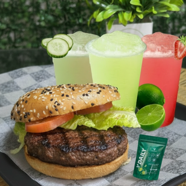 Limonada Natural con CUP de 🥤 V-DAILY Una bebida multivitamínica que impulsa tu energía y refuerza tu sistema inmune. Su fórmula con vitaminas, minerales, probióticos, prebióticos y superalimentos como hongos medicinales (shiitake, maitake, reishi, cordyceps), frutas y verduras, ayuda a optimizar la digestión, fortalecer huesos y músculos, y mantener el equilibrio nervioso y hormonal.