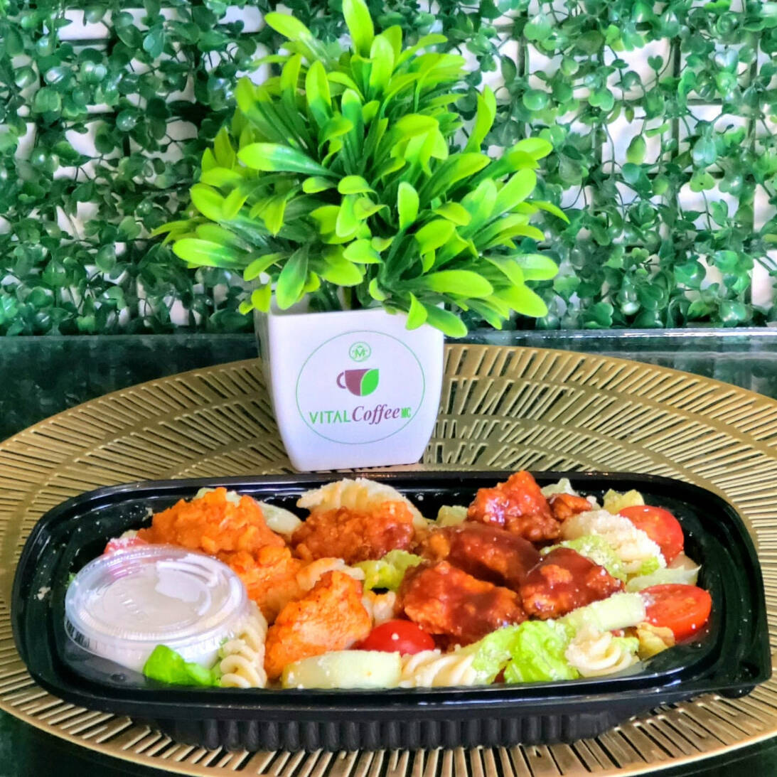 Bonneles BBQ o BÚFALO (150 grm de pollo en Freidora de Aire) -Calorías, Lechuga, Zanahoria, Pepino, Queso parmesano, Pasta Fusilli, Tomate Cherry