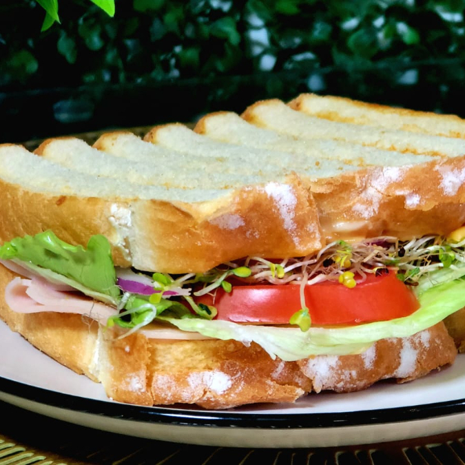 Triple Jamon de Pechuga de Pavo, queso amarillo, tomate, lechuga, cebolla, Alfalfa. Pan Masa Madre. Puedes personalizarlo con ingredientes extras