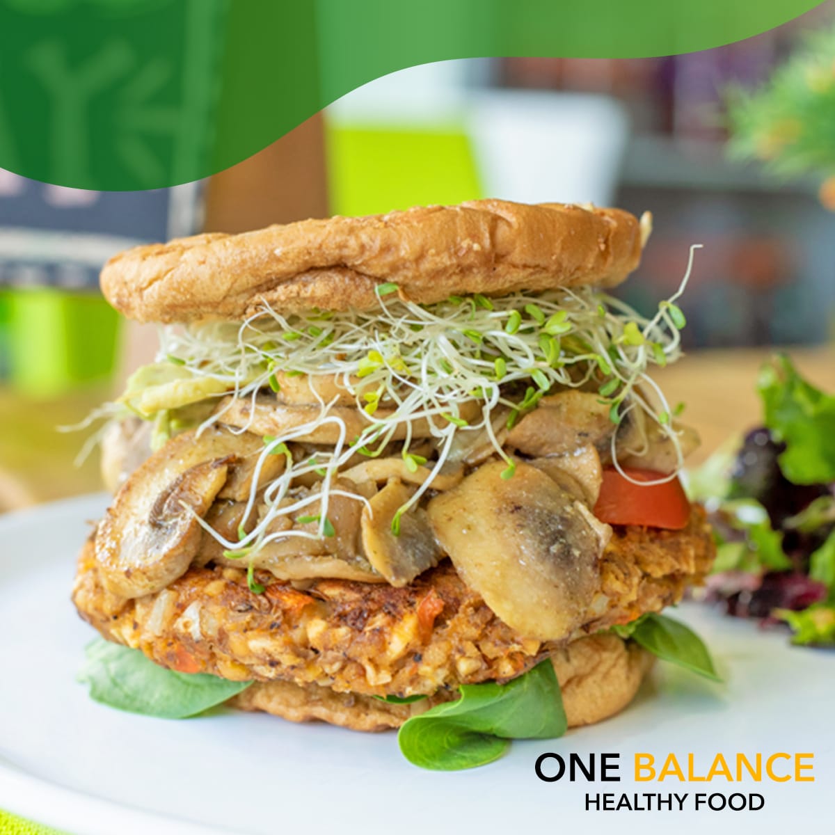 Deliciosa hamburguesa vegana hecha a base de zanahoria y garbanzo, con champiñones a la parrilla, espinacas baby, rodajas de jitomate, germen de alfalfa, aguacate pan de centeno y aderezo de la casa.