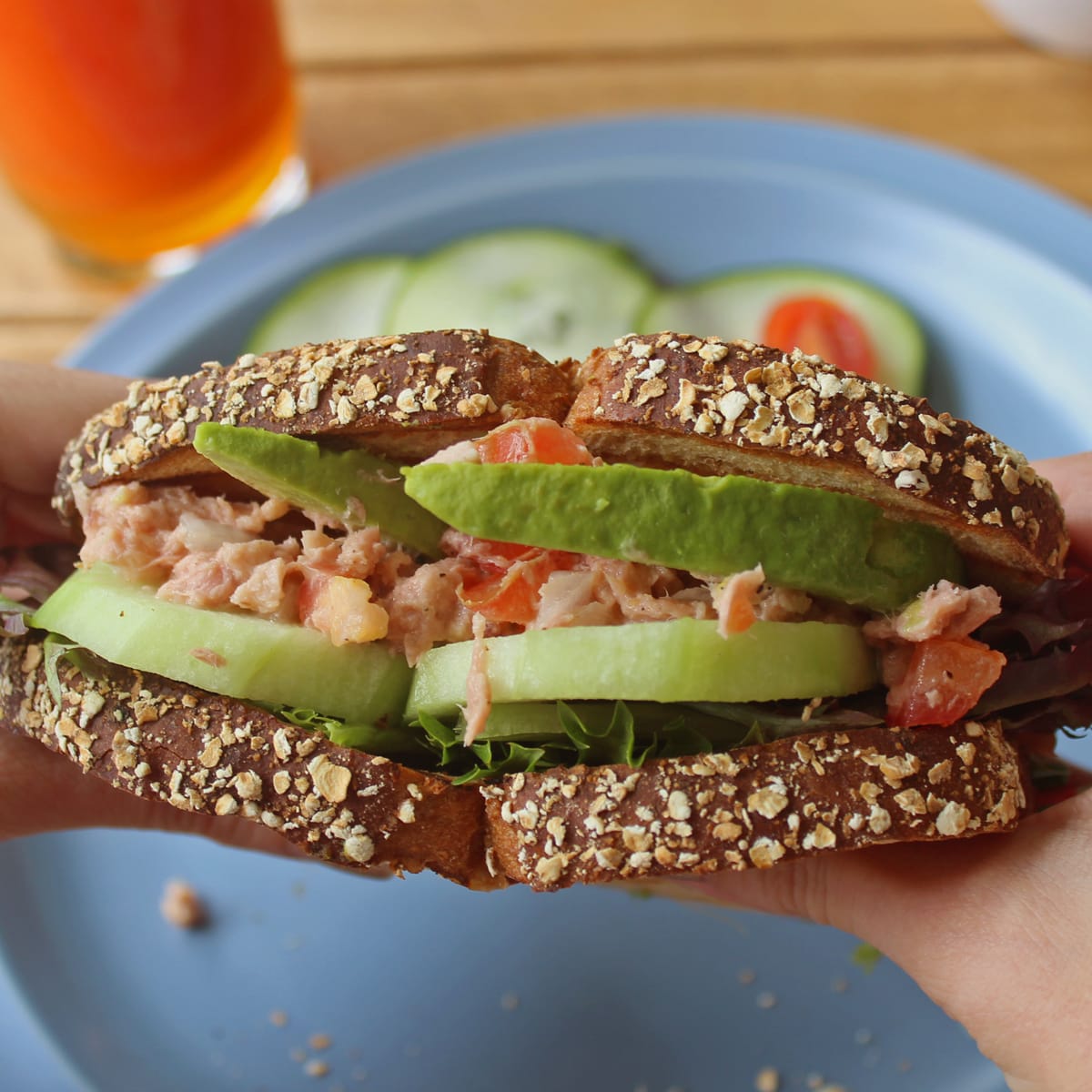 Delicioso sándwich de pan multigrano relleno de mix de lechuga, atún preparado, rodajas de pepino y aguacate