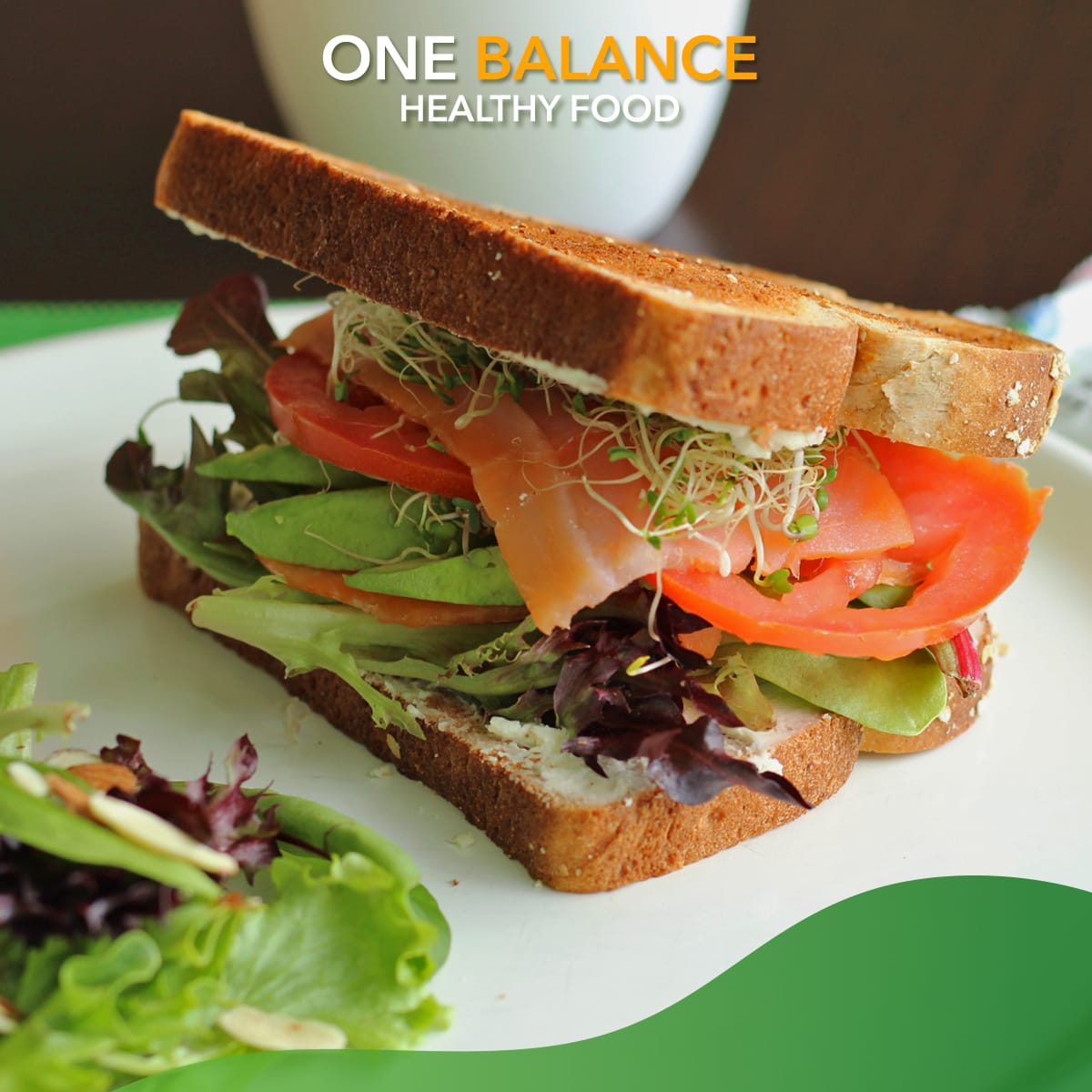 Exquisito sándwich relleno de espinaca , jitomate , aguacate , laminas de salmón ahumado y aderezo xcatic