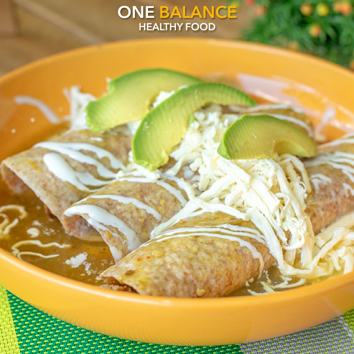Tortillas integrales rellenas de pollo y vegetales salteados, bañados en salsa verde hecha en casa y acompañados con queso oaxaca.